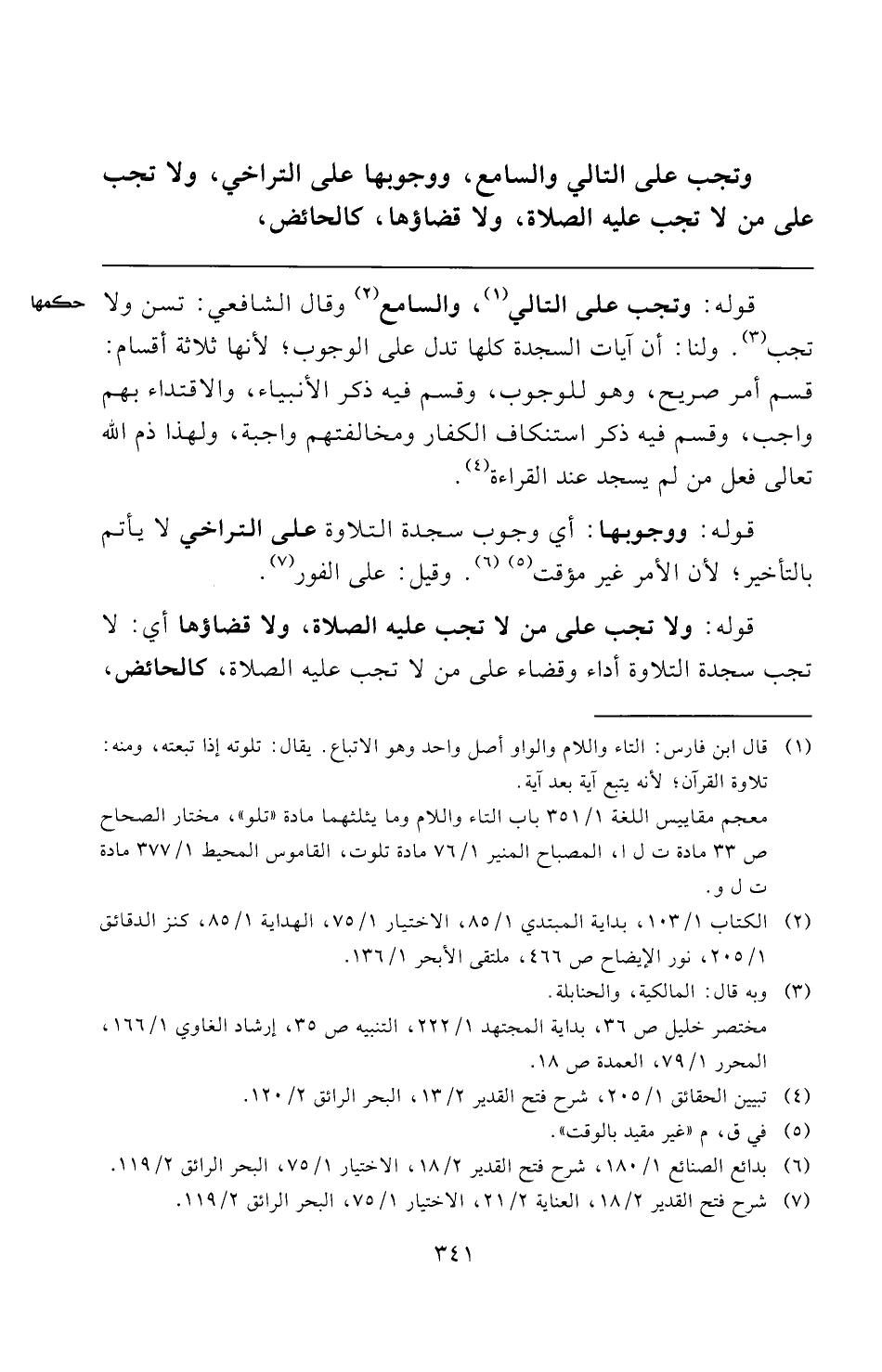 قوله: ولا تجب على من لا تجب عليه الصلاة، ولا قضاؤها أي: لا تجب سجدة التلاوة أداء وقضاء على من لا تجب عليه الصلاة، كالحائض،