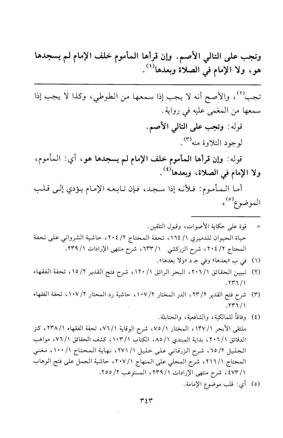 وتجب على التالي الأصم. وإن قرأها المأموم خلف الإمام لم يسجدها هو، ولا الإمام في الصلاة وبعدها (¬١).