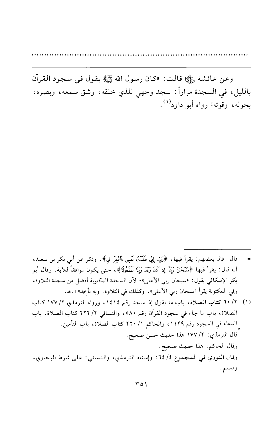 (¬١) ٢/ ٦٠ كتاب الصلاة، باب ما يقول إذا سجد رقم ١٤١٤، ورواه الترمذي ٢/ ١٧٧ كتاب الصلاة، باب ما جاء في سجود القرآن رقم ٥٨٠، والنسائي ٢/ ٢٢٢ كتاب الصلاة، باب الدعاء في السجود رقم ١١٢٩، والحاكم ١/ ٢٢٠ كتاب الصلاة، باب التأمين.