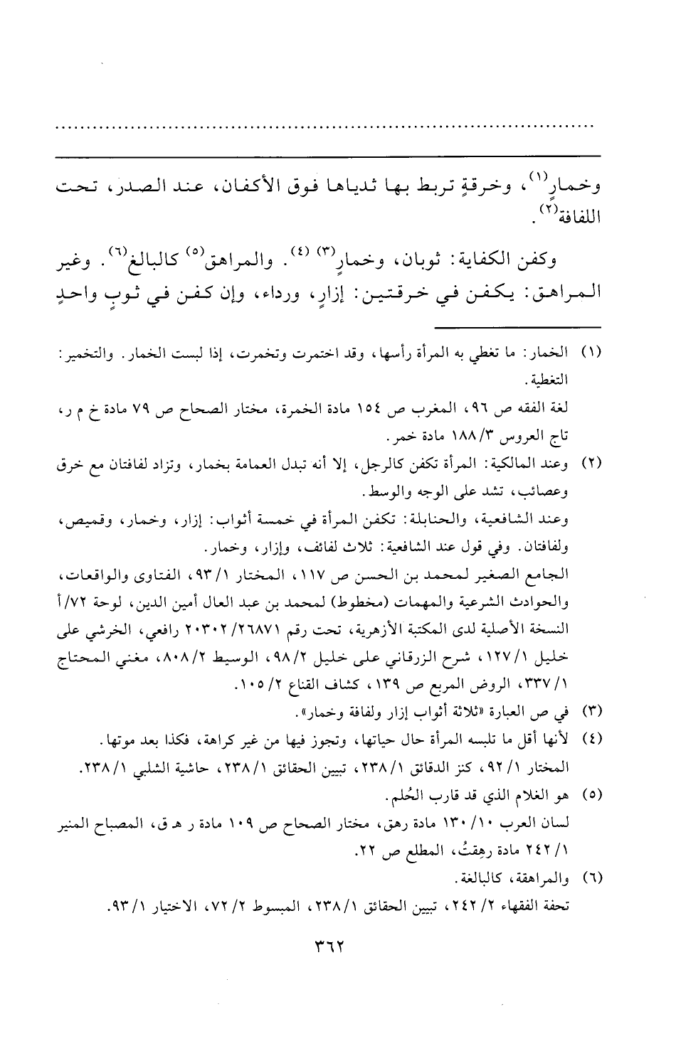 وكفن الكفاية: ثوبان، وخمارٍ (¬٣) (¬٤). والمراهق (¬٥) كالبالغ (¬٦). وغير المراهق: يكفن في خرقتين: إزارٍ، ورداء، وإن كفن في ثوبٍ واحدٍ