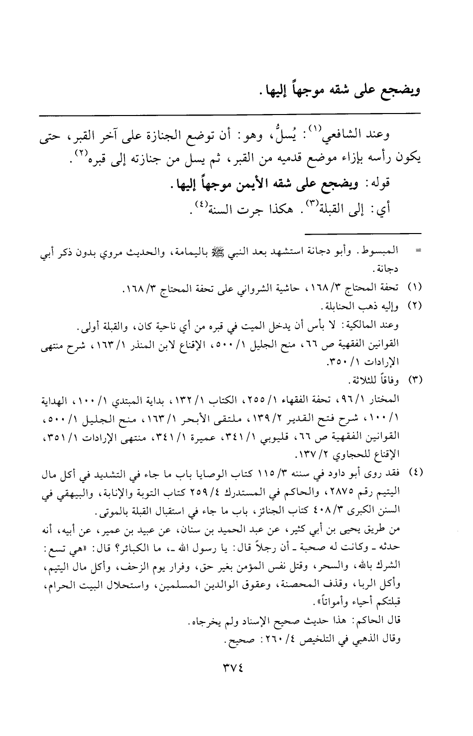 (¬٤) فقد روى أبو داود في سننه ٣/ ١١٥ كتاب الوصايا باب ما جاء في التشديد في أكل مال اليتيم رقم ٢٨٧٥، والحاكم في المستدرك ٤/ ٢٥٩ كتاب التوبة والإنابة، والبيهقي في السنن الكبرى ٣/ ٤٠٨ كتاب الجنائز، باب ما جاء في استقبال القبلة بالموتى.