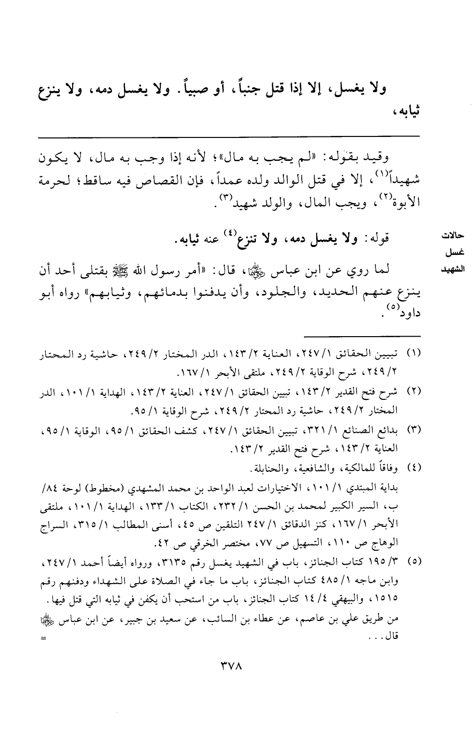 ولا يغسل، إلا إذا قتل جنبًا، أو صبيًا. ولا يغسل دمه، ولا ينزع ثيابه،