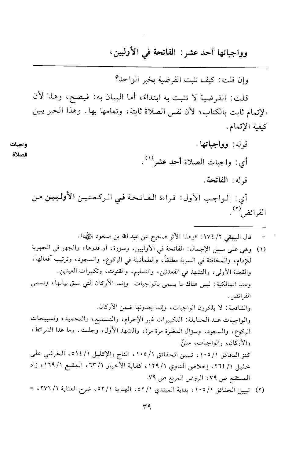 وواجباتها أحد عشر: الفاتحة في الأوليين،