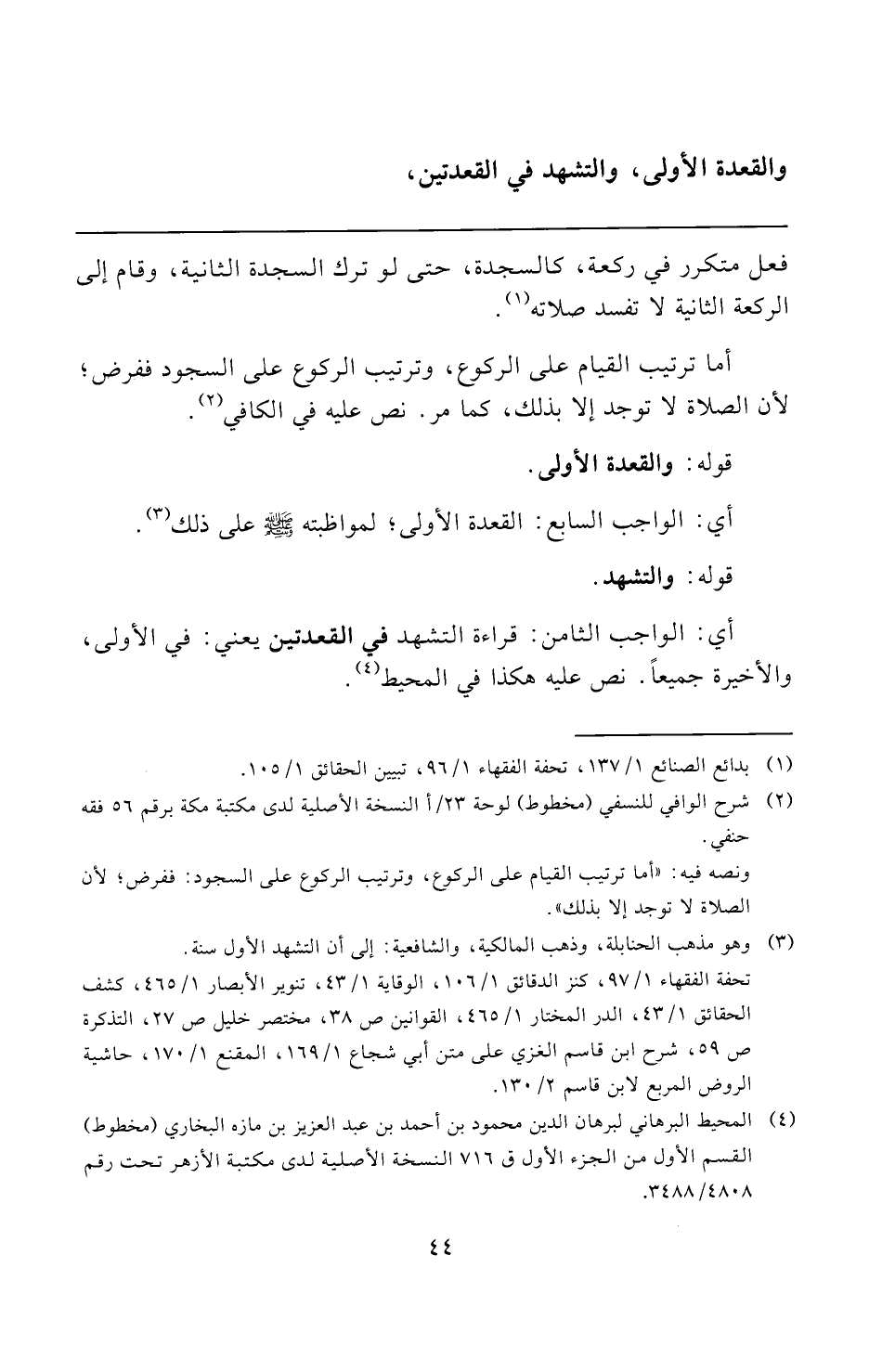 (¬٤) المحيط البرهاني لبرهان الدين محمود بن أحمد بن عبد العزيز بن مازه البخاري (مخطوط) القسم الأول من الجزء الأول ق ٧١٦ النسخة الأصلية لدى مكتبة الأزهر تحت رقم ٤٨٠٨/ ٣٤٨٨.