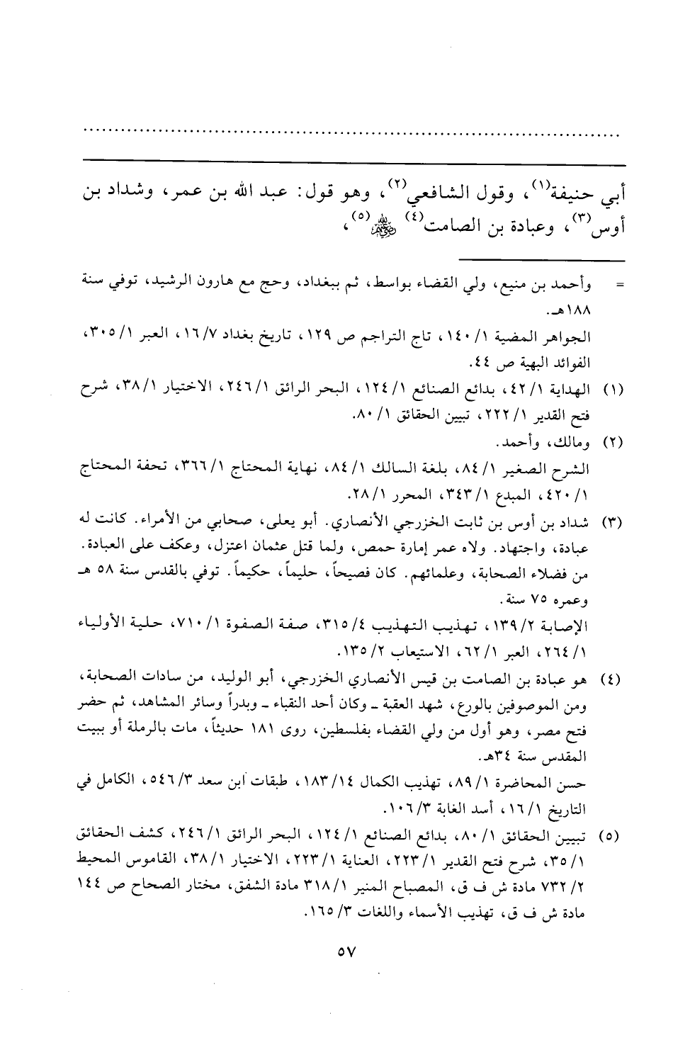 (¬٤) هو عبادة بن الصامت بن قيس الأنصاري الخزرجي، أبو الوليد، من سادات الصحابة، ومن الموصوفين بالورع، شهد العقبة -وكان أحد النقباء- وبدرًا وسائر المشاهد، ثم حضر فتح مصر، وهو أول من ولي القضاء بفلسطين، روى ١٨١ حديثًا، مات بالرملة أو ببيت المقدس سنة ٣٤ هـ.