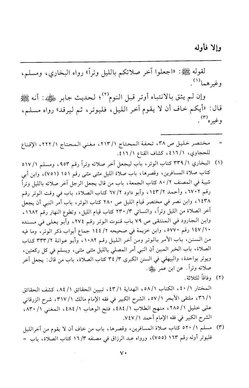 (¬١) البخاري ١/ ٣٣٩ كتاب الوتر، باب ليجعل آخر صلاته وترًا رقم ٩٥٣، ومسلم ١/ ٥١٧ كتاب صلاة المسافرين، وقصرها، باب صلاة الليل مثنى مثنى رقم ١٥١ (٧٥١)، وابن أبي شيبة في المصنف ٢/ ٨٠ كتاب الجمعة، باب من قال يجعل الرجل آخر صلاته بالليل وترًا رقم ٦٧٠٢، وأحمد ٢/ ١٤٣، وأبو داود ٢/ ٦٧ كتاب الصلاة، باب في وقت الوتر رقم ١٤٣٨، وابن نصر في مختصر قيام الليل ص ٢٨٠ كتاب الوتر، باب أمر النبي أن يجعل آخر الصلاة من الليل وترًا، والنسائي ٣/ ٢٣٠ كتاب قيام الليل، وتطوع النهار رقم ١٦٨٢، وابن الجارود في المنتقى ص ٧٩ باب قنوت الوتر رقم ٢٧٤، وأبو يعلى في مسنده ١٠/ ١٤٧ رقم ٥٧٧٠، وابن خزيمة في صحيحه ٢/ ١٤٤ جماع أبواب ذكر الوتر، وما فيه من السنن، باب الأمر بالوتر ومن آخر الليل رقم ١٠٨٢، وأبو عوانة ٢/ ٣٣٣ كتاب الصلاة، باب الخبر المبين أن النبي أمر المصلي بالليل مثنى مثنى، ويسلم في كل ركعتين، ويوتر بواحدة، والبيهقي في السنن الكبرى ٣/ ٣٤ كتاب الصلاة، باب من قال: يجعل آخر صلاته وترًا. عن ابن عمر -رضي الله عنهما-.