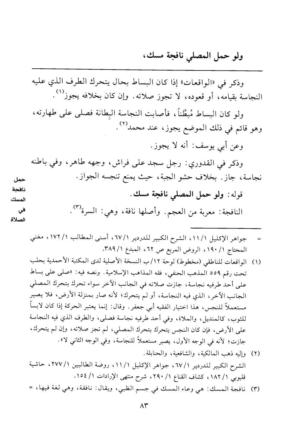 (¬١) الواقعات للناطقي (مخطوط) لوحة ١٢/ ب النسخة الأصلية لدى المكتبة الأحمدية بحلب تحت رقم ٥٥٩ المذهب الحنفي، فقه المذاهب الإسلامية. ونصه فيه: "صلى على بساط على أحد طرفيه نجاسة، جازت صلاته في الجانب الآخر سواء تحرك بتحرك المصلي الجانب الآخر، الذي فيه النجاسة، أو لم يتحرك؛ لأنه صار بمنزلة الأرض، فلا يصير مستعملًا للنجس، هذا اختيار الفقيه أبي جعفر. وقال: إنما يعتبر الحركة إذا كان لابسًا للثوب، كالمنديل، والملاة، وفي أحد طرفيه نجاسة فصلى، والطرف الذي فيه النجاسة على الأرض، فإن كان النجس يتحرك بتحرك المصلي، لم تجز صلاته، وإن لم يتحرك، جازت؛ لأنه في الوجه الأول، يصير مستعملًا للنجاسة، وفي الوجه الثاني لا".
