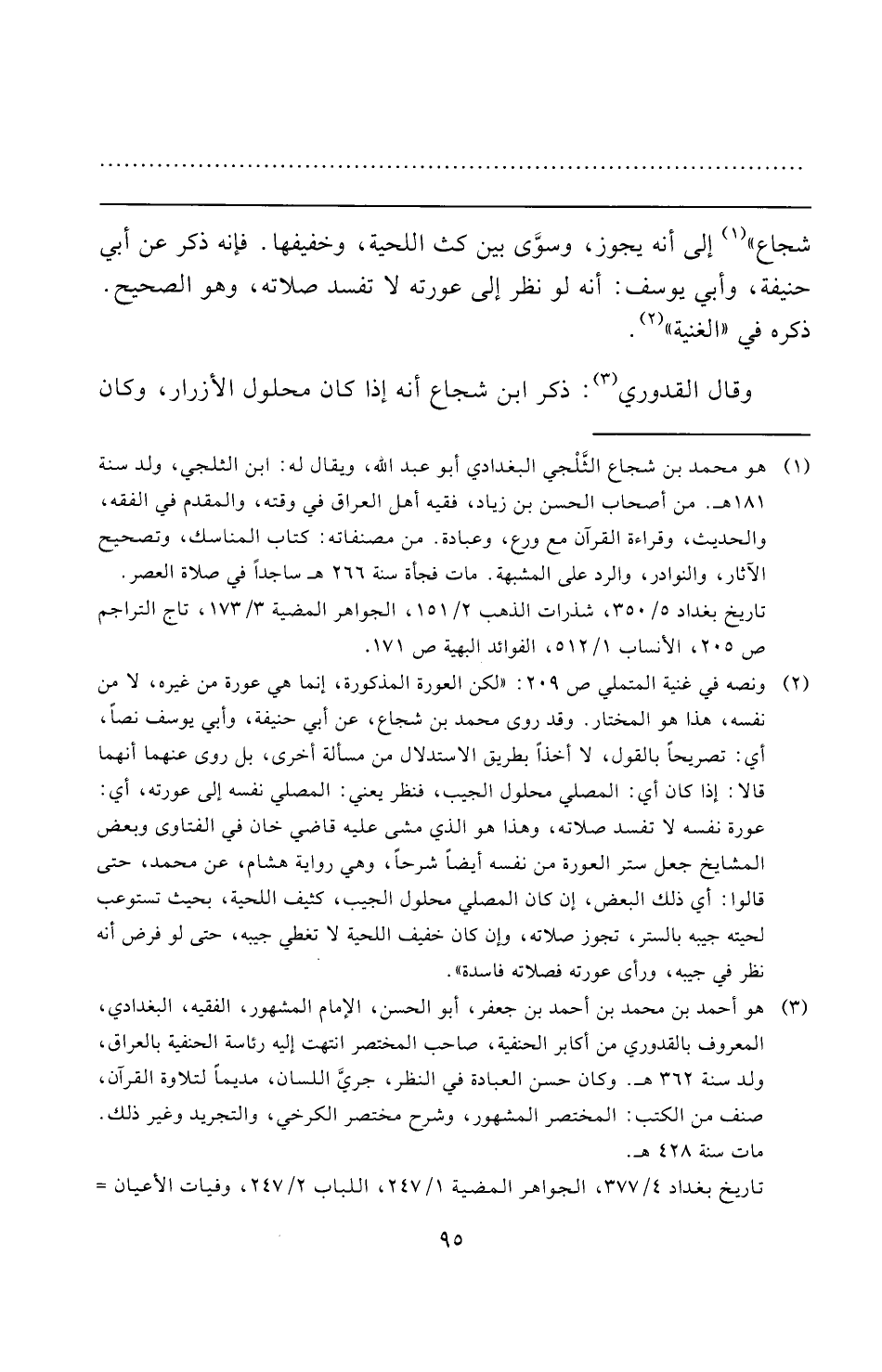 (¬١) هو محمد بن شجاع الثَّلْجي البغدادي أبو عبد الله، ويقال له: ابن الثلجي، ولد سنة ١٨١ هـ. من أصحاب الحسن بن زياد، فقيه أهل العراق في وقته، والمقدم في الفقه، والحديث، وقراءة القرآن مع ورع، وعبادة. من مصنفاته: كتاب المناسك، وتصحيح الآثار، والنوادر، والرد على المشبهة. مات فجأة سنة ٢٦٦ هـ ساجدًا في صلاة العصر.