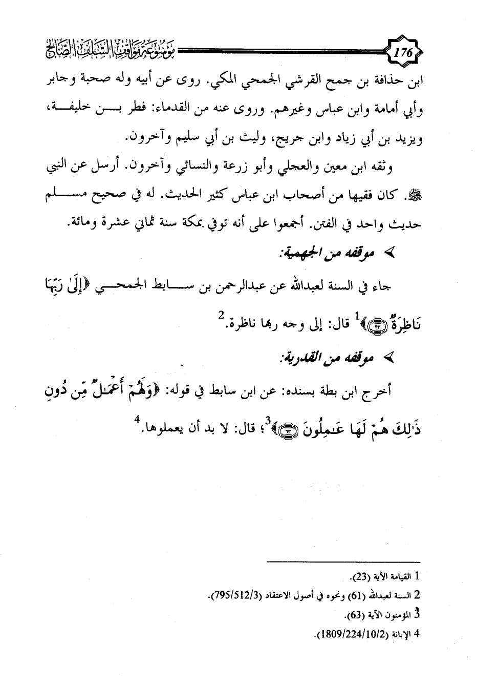جاء في السنة لعبد الله عن عبد الرحمن بن سابط الجمحي {إلى ربها نَاظِرَةٌ} (¬1) قال: إلى وجه ربها ناظرة. (¬2)