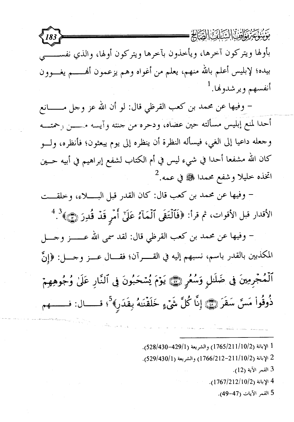 - وفيها عن محمد بن كعب القرظي قال: لقد سمى الله عز وجل المكذبين بالقدر باسم، نسبهم إليه في القرآن؛ فقال عز وجل: {إِنَّ الْمُجْرِمِينَ فِي ضَلَالٍ وَسُعُرٍ (47) يَوْمَ يُسْحَبُونَ فِي النَّارِ عَلَى وُجُوهِهِمْ ذُوقُوا مَسَّ سَقَرَ (48) إِنَّا كُلَّ شَيْءٍ خَلَقْنَاهُ بِقَدَرٍ} (¬5)؛ قال: فهم