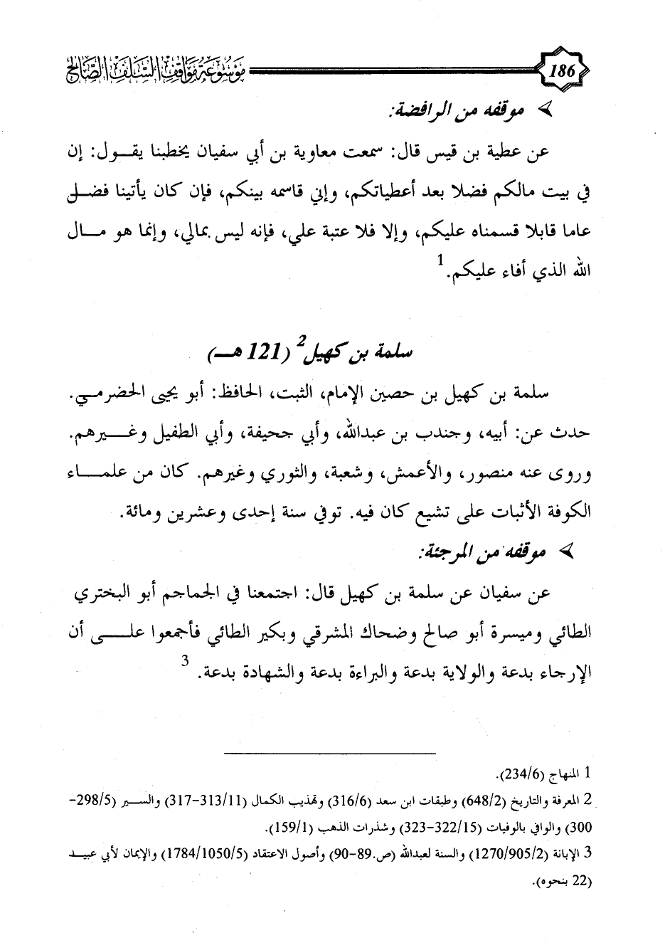 عن سفيان عن سلمة بن كهيل قال: اجتمعنا في الجماجم أبو البختري الطائي وميسرة أبو صالح وضحاك المِشْرَقِيّ وبكير الطائي فأجمعوا على أن الإرجاء بدعة والولاية بدعة والبراءة بدعة والشهادة بدعة. (¬3)