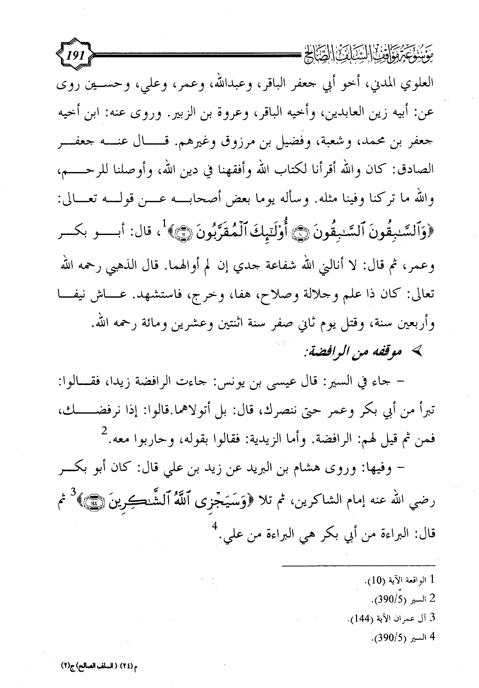 - جاء في السير: قال عيسى بن يونس: جاءت الرافضة زيدا، فقالوا: تبرأ من أبي بكر وعمر حتى ننصرك، قال: بل أتولاهما. قالوا: إذا نرفضك، فمن ثم قيل لهم: الرافضة. وأما الزيدية: فقالوا بقوله، وحاربوا معه. (¬2)