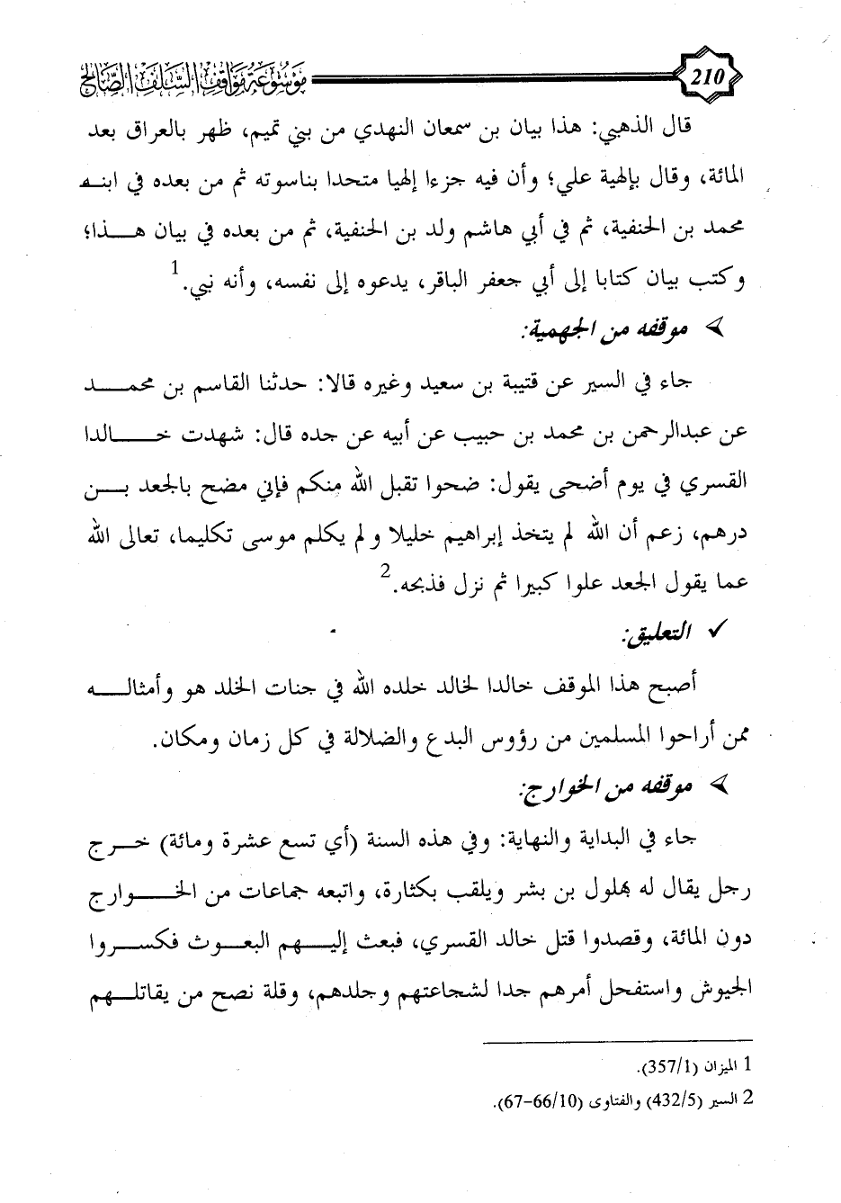 جاء في السير عن قتيبة بن سعيد وغيره قالا: حدثنا القاسم بن محمد عن عبد الرحمن بن محمد بن حبيب عن أبيه عن جده قال: شهدت خالدا القسري في يوم أضحى يقول: ضحوا تقبل الله منكم فإني مضح بالجعد بن درهم، زعم أن الله لم يتخذ إبراهيم خليلا ولم يكلم موسى تكليما، تعالى الله عما يقول الجعد علوا كبيرا ثم نزل فذبحه. (¬2)
