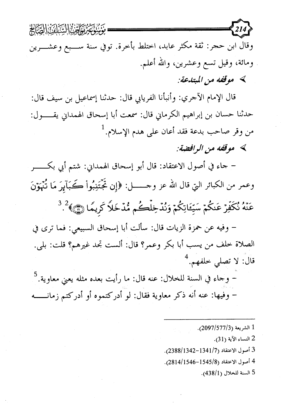 - جاء في أصول الاعتقاد: قال أبو إسحاق الهمداني: شتم أبي بكر وعمر من الكبائر التي قال الله عز وجل: {إِنْ تَجْتَنِبُوا كَبَائِرَ مَا تُنْهَوْنَ عَنْهُ نُكَفِّرْ عَنْكُمْ سَيِّئَاتِكُمْ وَنُدْخِلْكُمْ مُدْخَلًا كَرِيمًا} (¬2). (¬3)