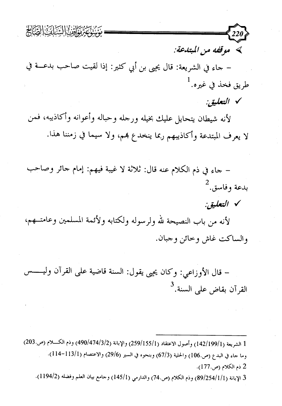 - جاء في ذم الكلام عنه قال: ثلاثة لا غيبة فيهم: إمام جائر وصاحب بدعة وفاسق. (¬2)