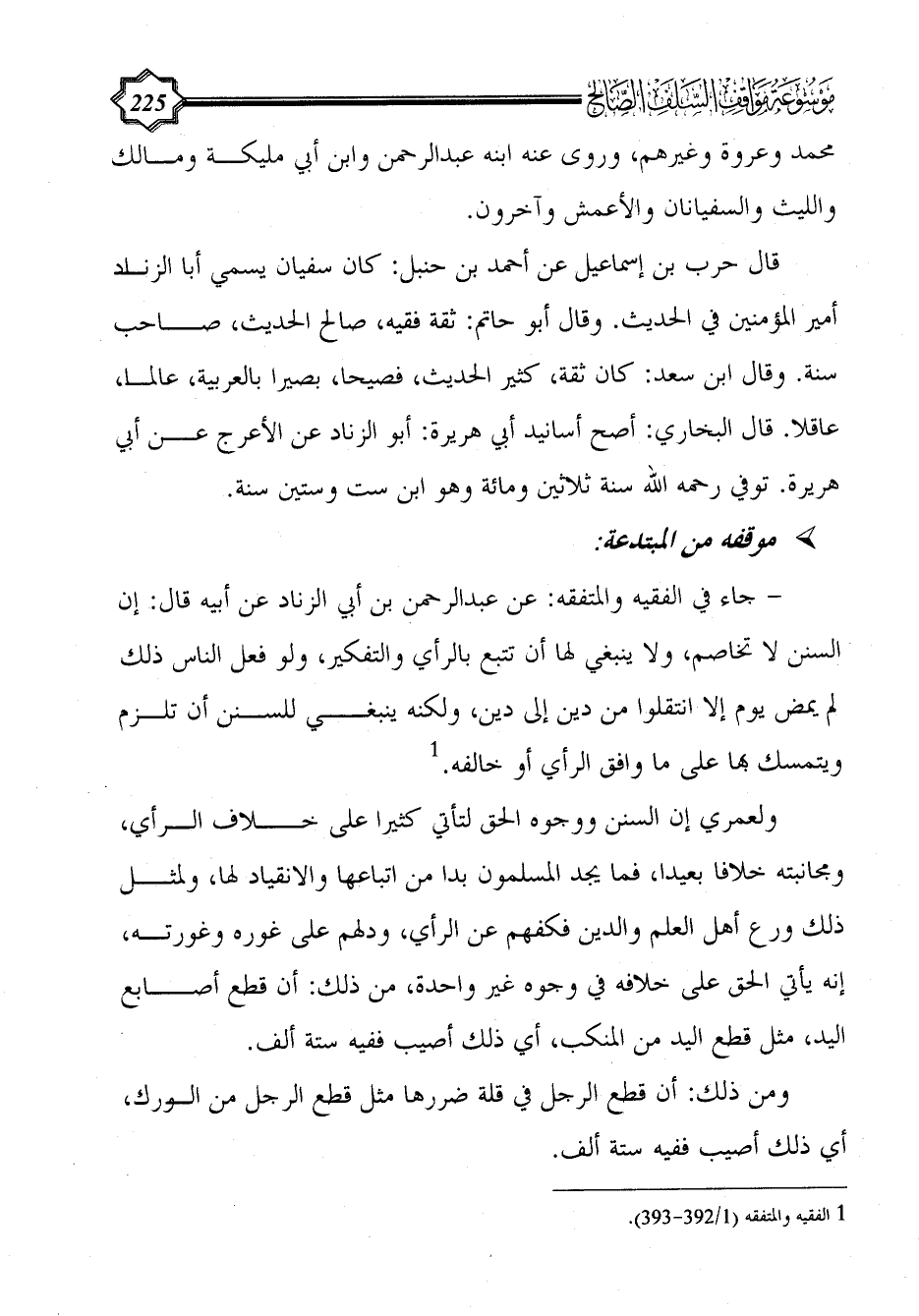 - جاء في الفقيه والمتفقه: عن عبد الرحمن بن أبي الزناد عن أبيه قال: إن السنن لا تخاصم، ولا ينبغي لها أن تتبع بالرأي والتفكير، ولو فعل الناس ذلك لم يمض يوم إلا انتقلوا من دين إلى دين، ولكنه ينبغي للسنن أن تلزم ويتمسك بها على ما وافق الرأي أو خالفه. (¬1)