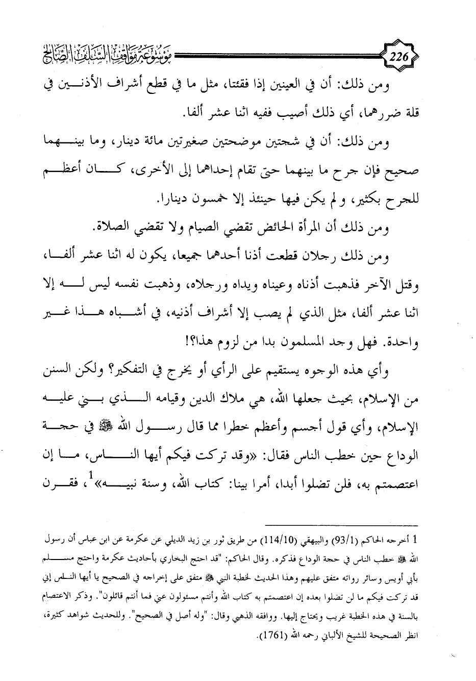 وأي هذه الوجوه يستقيم على الرأي أو يخرج في التفكير؟ ولكن السنن من الإسلام، بحيث جعلها الله، هي ملاك الدين وقيامه الذي بني عليه الإسلام، وأي قول أجسم وأعظم خطرا مما قال رسول الله - صلى الله عليه وسلم - في حجة الوداع حين خطب الناس فقال: "وقد تركت فيكم أيها الناس، ما إن اعتصمتم به، فلن تضلوا أبدا، أمرا بينا: كتاب الله، وسنة نبيه" (¬1)، فقرن
