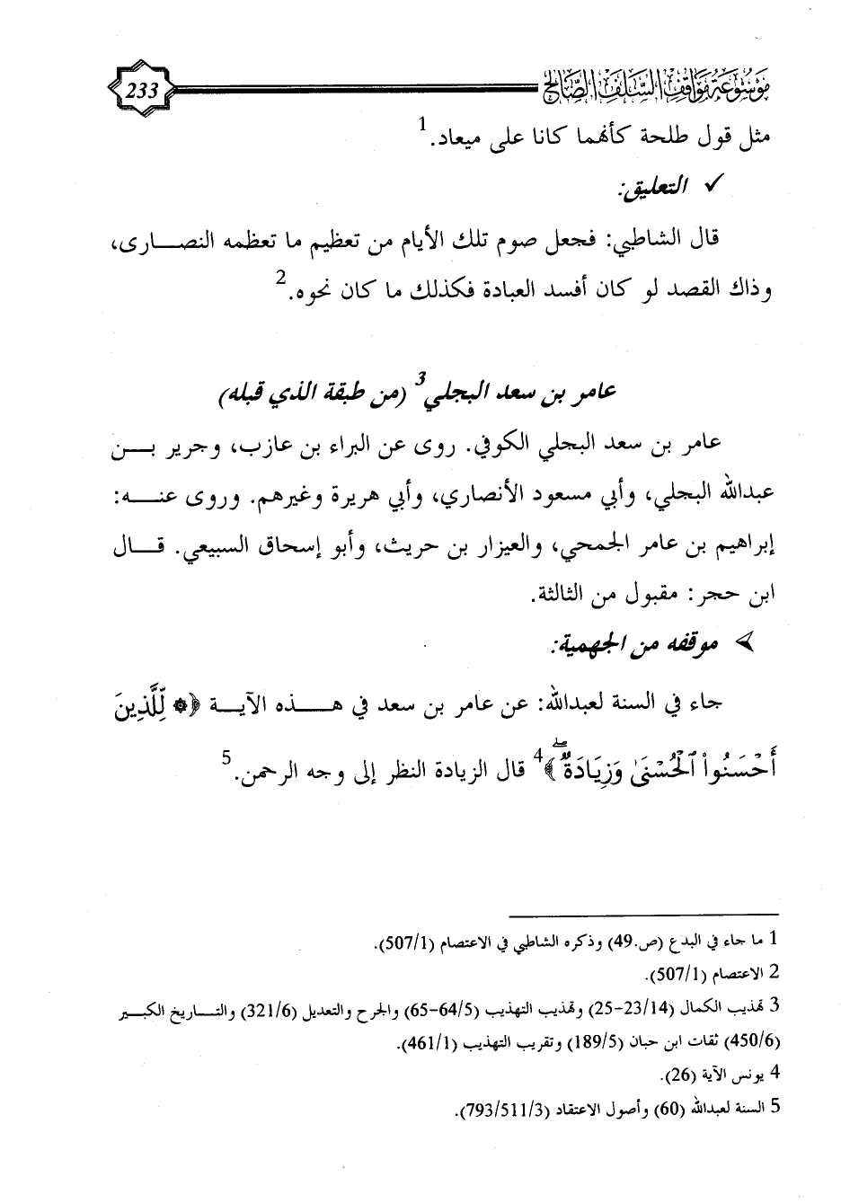 جاء في السنة لعبد الله: عن عامر بن سعد في هذه الآية {لِلَّذِينَ أَحْسَنُوا الْحُسْنَى وزيادة} (¬4) قال الزيادة النظر إلى وجه الرحمن. (¬5)