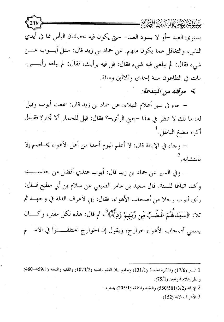 - وفي السير عن حماد بن زيد قال: أيوب عندي أفضل من جالسته وأشد اتباعا للسنة. قال سعيد بن عامر الضبعي عن سلام بن أبي مطيع قال: رأى أيوب رجلا من أصحاب الأهواء، فقال: إني لأعرف الذلة في وجهه ثم تلا: {سينالهم غضبٌ من ربهم وذلة} (¬3)، ثم قال: هذه لكل مفتر، وكان يسمي أصحاب الأهواء خوارج، ويقول إن الخوارج اختلفوا في الاسم