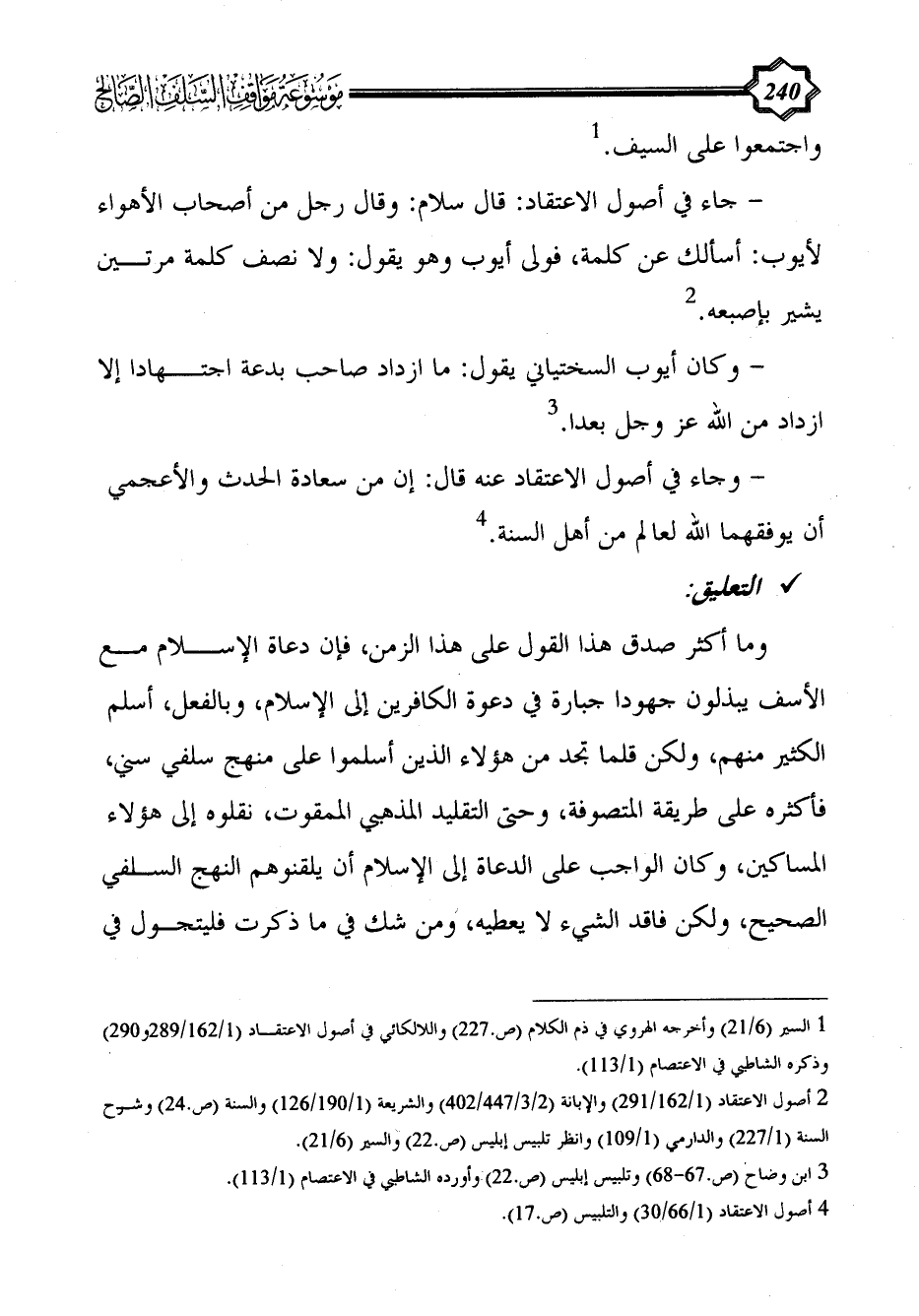 (¬2) أصول الاعتقاد (1/ 162/291) والإبانة (2/ 3/447/ 402) والشريعة (1/ 190/126) والسنة (ص.24) وشرح السنة (1/ 227) والدارمي (1/ 109) وانظر تلبيس إبليس (ص.22) والسير (6/ 21).