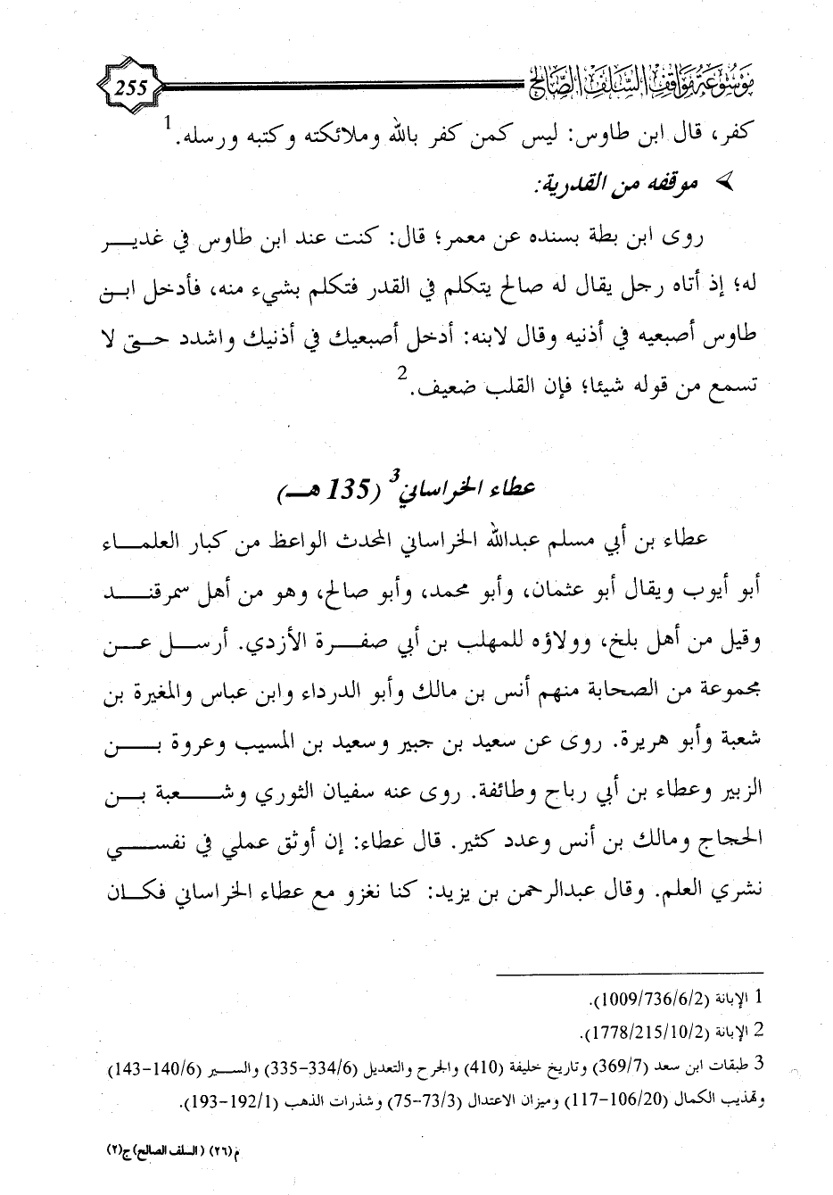 روى ابن بطة بسنده عن معمر؛ قال: كنت عند ابن طاوس في غدير له؛ إذ أتاه رجل يقال له صالح يتكلم في القدر فتكلم بشيء منه، فأدخل ابن طاوس أصبعيه في أذنيه وقال لابنه: أدخل أصبعيك في أذنيك واشدد حتى لا تسمع من قوله شيئا؛ فإن القلب ضعيف. (¬2)