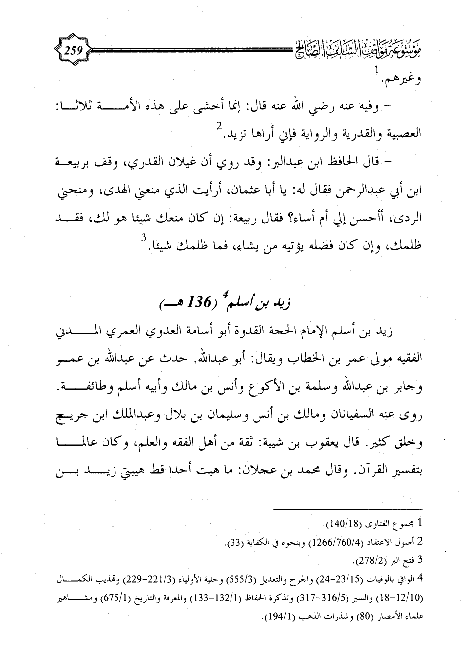 زيد بن أَسْلَم الإمام الحجة القدوة أبو أسامة العَدَوِي العمري المدني الفقيه مولى عمر بن الخطاب ويقال: أبو عبد الله. حدث عن عبد الله بن عمر وجابر بن عبد الله وسلمة بن الأكوع وأنس بن مالك وأبيه أسلم وطائفة. روى عنه السفيانان ومالك بن أنس وسليمان بن بلال وعبد الملك ابن جريج وخلق كثير. قال يعقوب بن شيبة: ثقة من أهل الفقه والعلم، وكان عالما بتفسير القرآن. وقال محمد بن عجلان: ما هبت أحدا قط هيبتي زيد