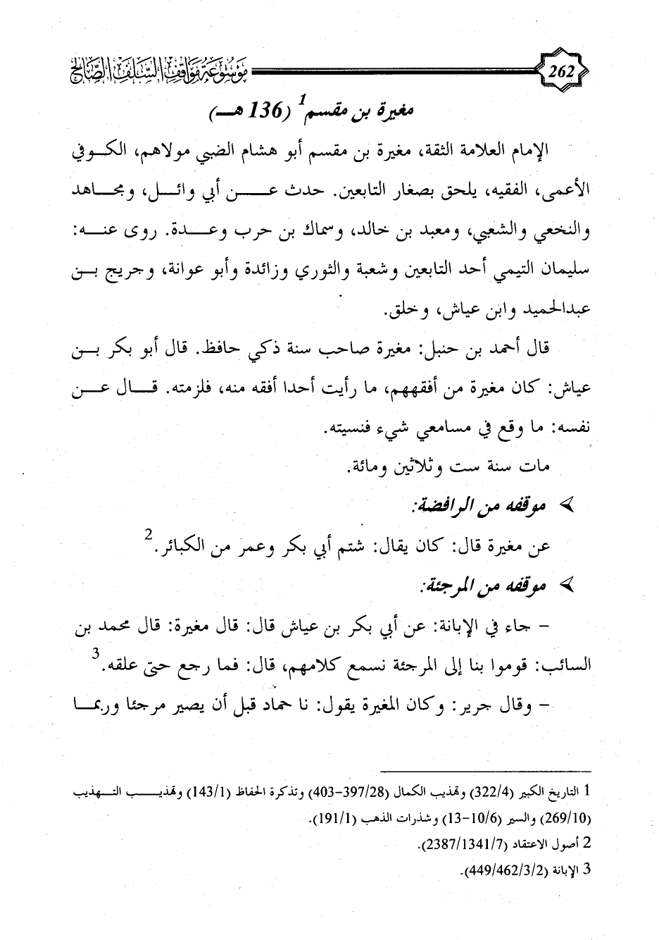 - جاء في الإبانة: عن أبي بكر بن عياش قال: قال مغيرة: قال محمد بن السائب: قوموا بنا إلى المرجئة نسمع كلامهم، قال: فما رجع حتى علقه. (¬3)