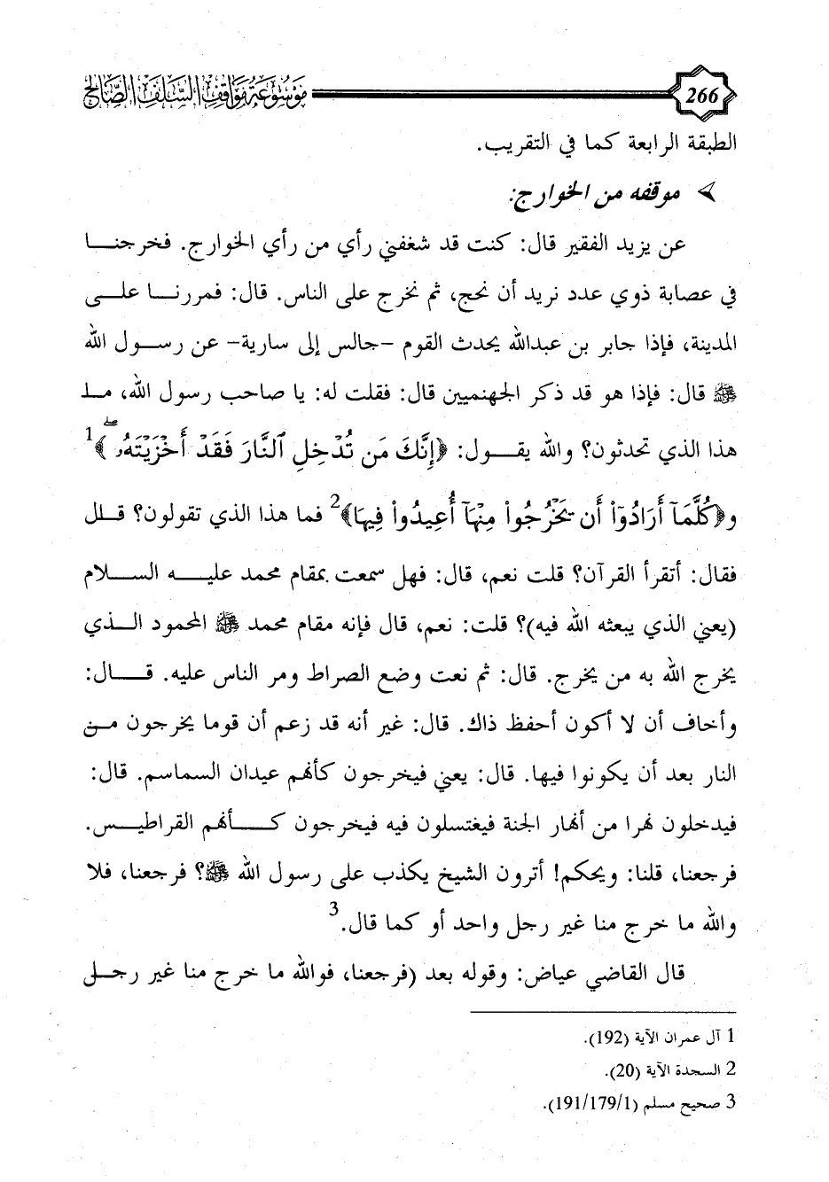 عن يزيد الفقير قال: كنت قد شغفني رأي من رأي الخوارج. فخرجنا في عصابة ذوي عدد نريد أن نحج، ثم نخرج على الناس. قال: فمررنا على المدينة، فإذا جابر بن عبد الله يحدث القوم -جالس إلى سارية- عن رسول الله - صلى الله عليه وسلم - قال: فإذا هو قد ذكر الجهنميين قال: فقلت له: يا صاحب رسول الله، ما هذا الذي تحدثون؟ والله يقول: {رَبَّنَا إِنَّكَ مَنْ تُدْخِلِ النَّارَ فَقَدْ أَخْزَيْتَهُ} (¬1) و {كُلَّمَا أَرَادُوا أَنْ يَخْرُجُوا مِنْهَا أُعِيدُوا فِيهَا} (¬2) فما هذا الذي تقولون؟ قال فقال: أتقرأ القرآن؟ قلت نعم، قال: فهل سمعت بمقام محمد عليه السلام (يعني الذي يبعثه الله فيه)؟ قلت: نعم، قال فإنه مقام محمد - صلى الله عليه وسلم - المحمود الذي يخرج الله به من يخرج. قال: ثم نعت وضع الصراط ومر الناس عليه. قال: وأخاف أن لا أكون أحفظ ذاك. قال: غير أنه قد زعم أن قوما يخرجون من النار بعد أن يكونوا فيها. قال: يعني فيخرجون كأنهم عيدان السماسم. قال: فيدخلون نهرا من أنهار الجنة فيغتسلون فيه فيخرجون كأنهم القراطيس. فرجعنا، قلنا: ويحكم! أترون الشيخ يكذب على رسول الله - صلى الله عليه وسلم -؟ فرجعنا، فلا والله ما خرج منا غير رجل واحد أو كما قال. (¬3)