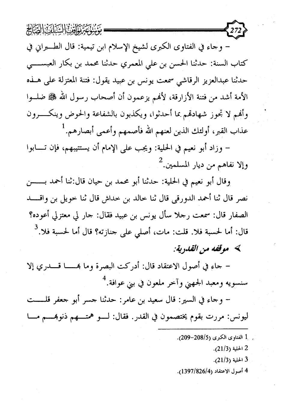 - جاء في أصول الاعتقاد قال: أدركت البصرة وما بها قدري إلا سنسويه ومعبد الجهني وآخر ملعون في بني عوافة. (¬4)