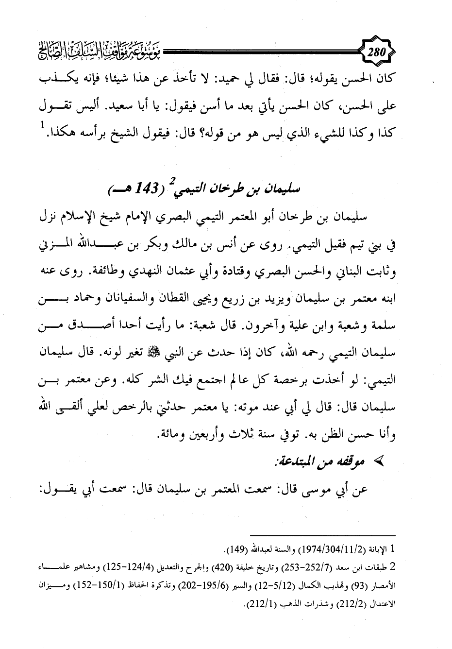 سليمان بن طَرْخَان أبو المعتمر التَّيْمِي البصري الإمام شيخ الإسلام نزل في بني تيم فقيل التيمي. روى عن أنس بن مالك وبكر بن عبد الله المزني وثابت البناني والحسن البصري وقتادة وأبي عثمان النهدي وطائفة. روى عنه ابنه معتمر بن سليمان ويزيد بن زريع ويحيى القطان والسفيانان وحماد بن سلمة وشعبة وابن علية وآخرون. قال شعبة: ما رأيت أحدا أصدق من سليمان التيمي رحمه الله، كان إذا حدث عن النبي - صلى الله عليه وسلم - تغير لونه. قال سليمان التيمي: لو أخذت برخصة كل عالم اجتمع فيك الشر كله. وعن معتمر بن سليمان قال: قال لي أبي عند موته: يا معتمر حدثني بالرخص لعلي ألقى الله وأنا حسن الظن به. توفي سنة ثلاث وأربعين ومائة.