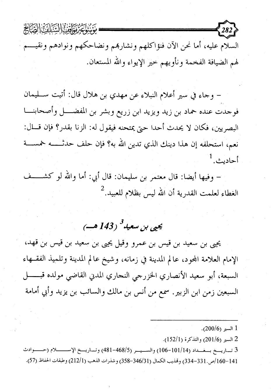 - وجاء في سير أعلام النبلاء عن مهدي بن هلال قال: أتيت سليمان فوجدت عنده حماد بن زيد ويزيد ابن زريع وبشر بن المفضل وأصحابنا البصريين، فكان لا يحدث أحدا حتى يمتحنه فيقول له: الزنا بقدر؟ فإن قال: نعم، استحلفه إن هذا دينك الذي تدين الله به؟ فإن حلف حدثه خمسة أحاديث. (¬1)