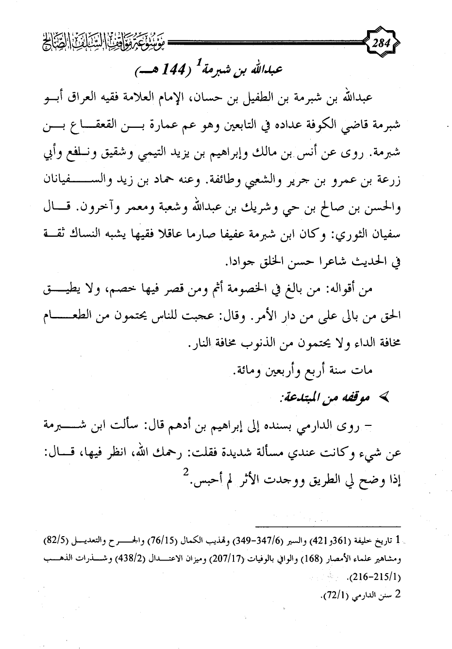 - روى الدارمي بسنده إلى إبراهيم بن أدهم قال: سألت ابن شبرمة عن شيء وكانت عندي مسألة شديدة فقلت: رحمك الله، انظر فيها، قال: إذا وضح لي الطريق ووجدت الأثر لم أحبس. (¬2)