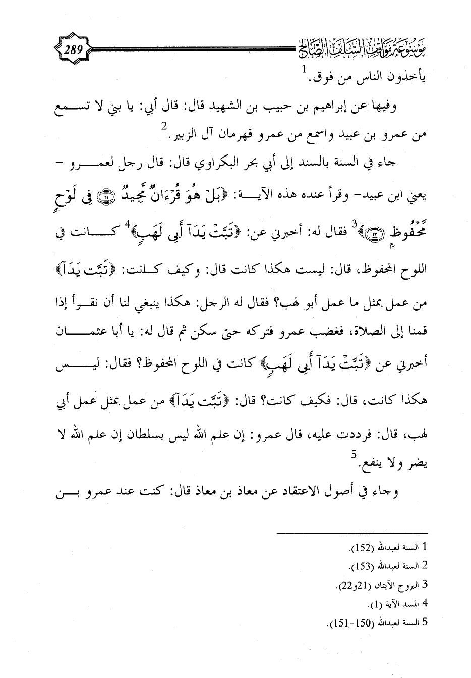 جاء في السنة بالسند إلى أبي بحر البكراوي قال: قال رجل لعمرو -يعني ابن عبيد- وقرأ عنده هذه الآية: {بَلْ هُوَ قُرْآنٌ مَجِيدٌ (21) فِي لَوْحٍ مَحْفُوظٍ} (¬3) فقال له: أخبرني عن: {تَبَّتْ يدا أبي لَهَبٍ} (¬4) كانت في اللوح المحفوظ، قال: ليست هكذا كانت قال: وكيف كانت: {تَبَّتْ يدا} من عمل بمثل ما عمل أبو لهب؟ فقال له الرجل: هكذا ينبغي لنا أن نقرأ إذا قمنا إلى الصلاة، فغضب عمرو فتركه حتى سكن ثم قال له: يا أبا عثمان أخبرني عن {تَبَّتْ يدا أبي لَهَبٍ} كانت في اللوح المحفوظ؟ فقال: ليس هكذا كانت، قال: فكيف كانت؟ قال: {تَبَّتْ يدا} من عمل بمثل عمل أبي لهب، قال: فرددت عليه، قال عمرو: إن علم الله ليس بسلطان إن علم الله لا يضر ولا ينفع. (¬5)