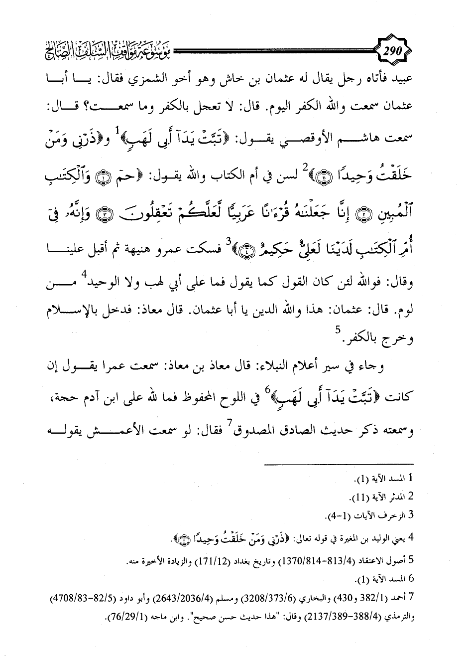 عبيد فأتاه رجل يقال له عثمان بن خاش وهو أخو الشمزي فقال: يا أبا عثمان سمعت والله الكفر اليوم. قال: لا تعجل بالكفر وما سمعت؟ قال: سمعت هاشم الأوقصي يقول: {تَبَّتْ يدا أبي لَهَبٍ} (¬1) و {ذرني وَمَنْ خَلَقْتُ وحيدًا} (¬2) لسن في أم الكتاب والله يقول: {حم (1) وَالْكِتَابِ الْمُبِينِ (2) إِنَّا جَعَلْنَاهُ قُرْآنًا عَرَبِيًّا لَعَلَّكُمْ تَعْقِلُونَ (3) وَإِنَّهُ فِي أُمِّ الْكِتَابِ لَدَيْنَا لَعَلِيٌّ حَكِيمٌ} (¬3) فسكت عمرو هنيهة ثم أقبل علينا وقال: فوالله لئن كان القول كما يقول فما على أبي لهب ولا الوحيد (¬4) من لوم. قال: عثمان: هذا والله الدين يا أبا عثمان. قال معاذ: فدخل بالإسلام وخرج بالكفر. (¬5)