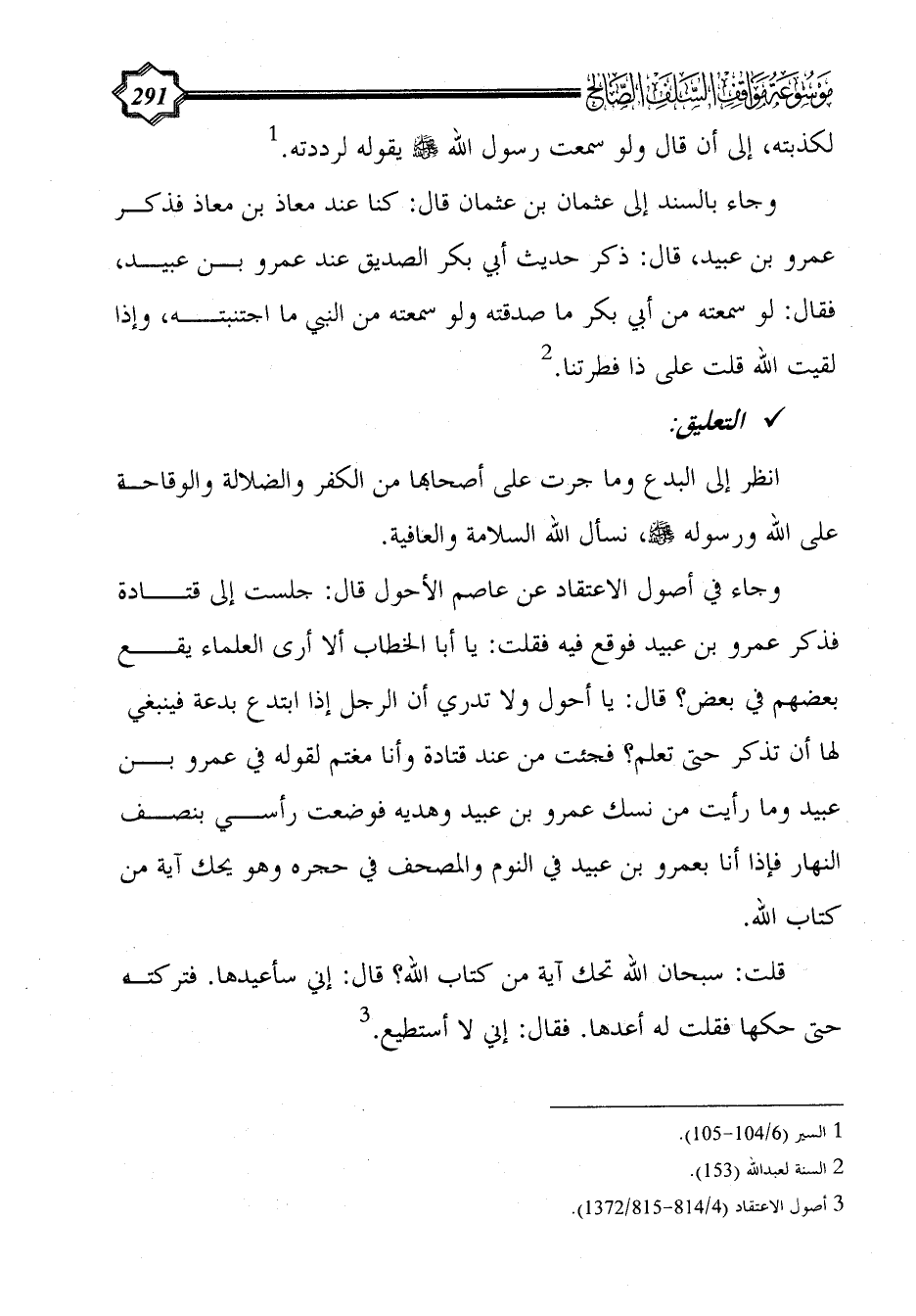 وجاء بالسند إلى عثمان بن عثمان قال: كنا عند معاذ بن معاذ فذكر عمرو بن عبيد، قال: ذكر حديث أبي بكر الصديق عند عمرو بن عبيد، فقال: لو سمعته من أبي بكر ما صدقته ولو سمعته من النبي ما اجتنبته، وإذا لقيت الله قلت على ذا فطرتنا. (¬2)