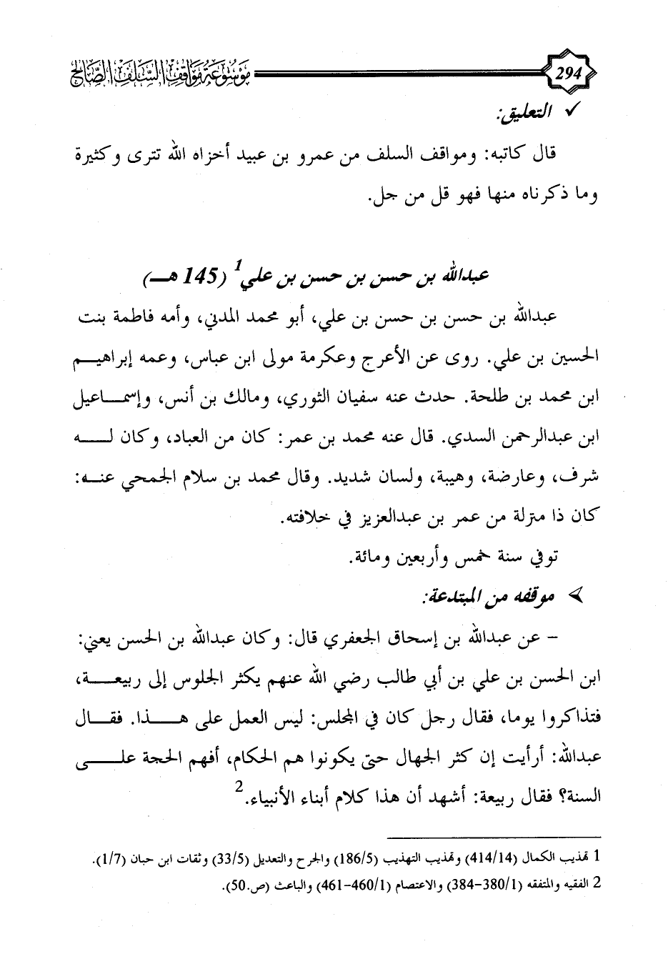 - عن عبد الله بن إسحاق الجعفري قال: وكان عبد الله بن الحسن يعني: ابن الحسن بن علي بن أبي طالب رضي الله عنهم يكثر الجلوس إلى ربيعة، فتذاكروا يوما، فقال رجل كان في المجلس: ليس العمل على هذا. فقال عبد الله: أرأيت إن كثر الجهال حتى يكونوا هم الحكام، أفهم الحجة على السنة؟ فقال ربيعة: أشهد أن هذا كلام أبناء الأنبياء. (¬2)
