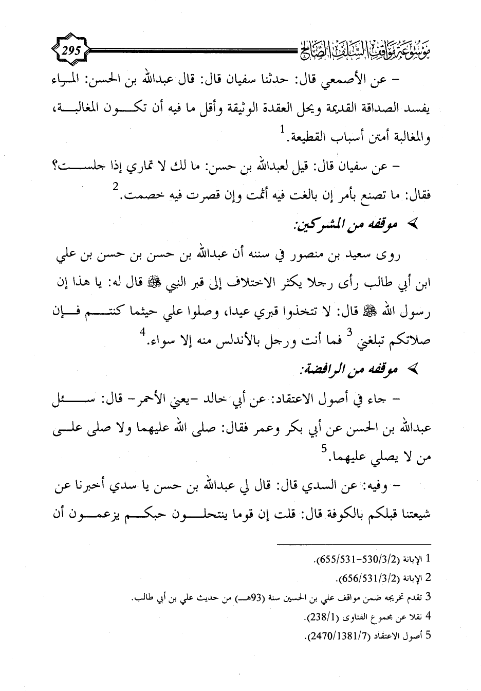 - جاء في أصول الاعتقاد: عن أبي خالد -يعني الأحمر- قال: سئل عبد الله بن الحسن عن أبي بكر وعمر فقال: صلى الله عليهما ولا صلى على من لا يصلي عليهما. (¬5)