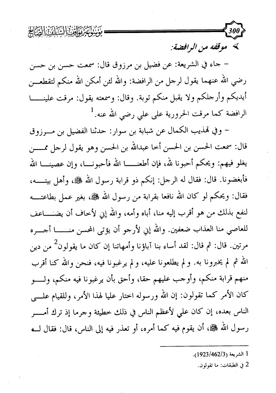 - جاء في الشريعة: عن فضيل بن مرزوق قال: سمعت حسن بن حسن رضي الله عنهما يقول لرجل من الرافضة: والله لئن أمكن الله منكم لتقطعن أيديكم وأرجلكم ولا يقبل منكم توبة. وقال: وسمعته يقول: مرقت علينا الرافضة كما مرقت الحرورية على علي رضي الله عنه. (¬1)