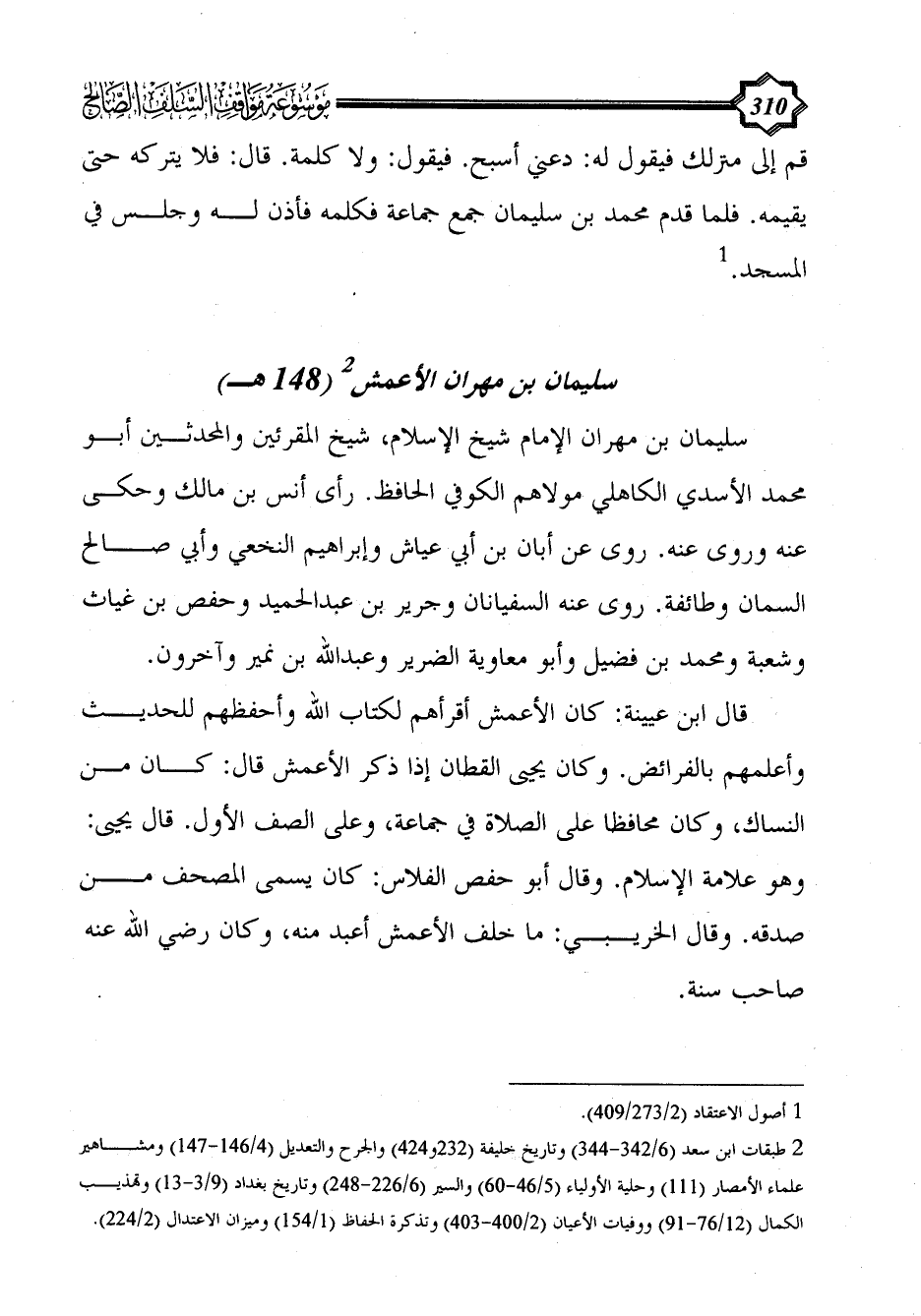 سليمان بن مِهْرَان الإمام شيخ الإسلام، شيخ المقرئين والمحدثين أبو محمد الأسدي الكاهلي مولاهم الكوفي الحافظ. رأى أنس بن مالك وحكى عنه وروى عنه. روى عن أبان بن أبي عياش وإبراهيم النخعي وأبي صالح السمان وطائفة. روى عنه السفيانان وجرير بن عبد الحميد وحفص بن غياث وشعبة ومحمد بن فضيل وأبو معاوية الضرير وعبد الله بن نمير وآخرون.
