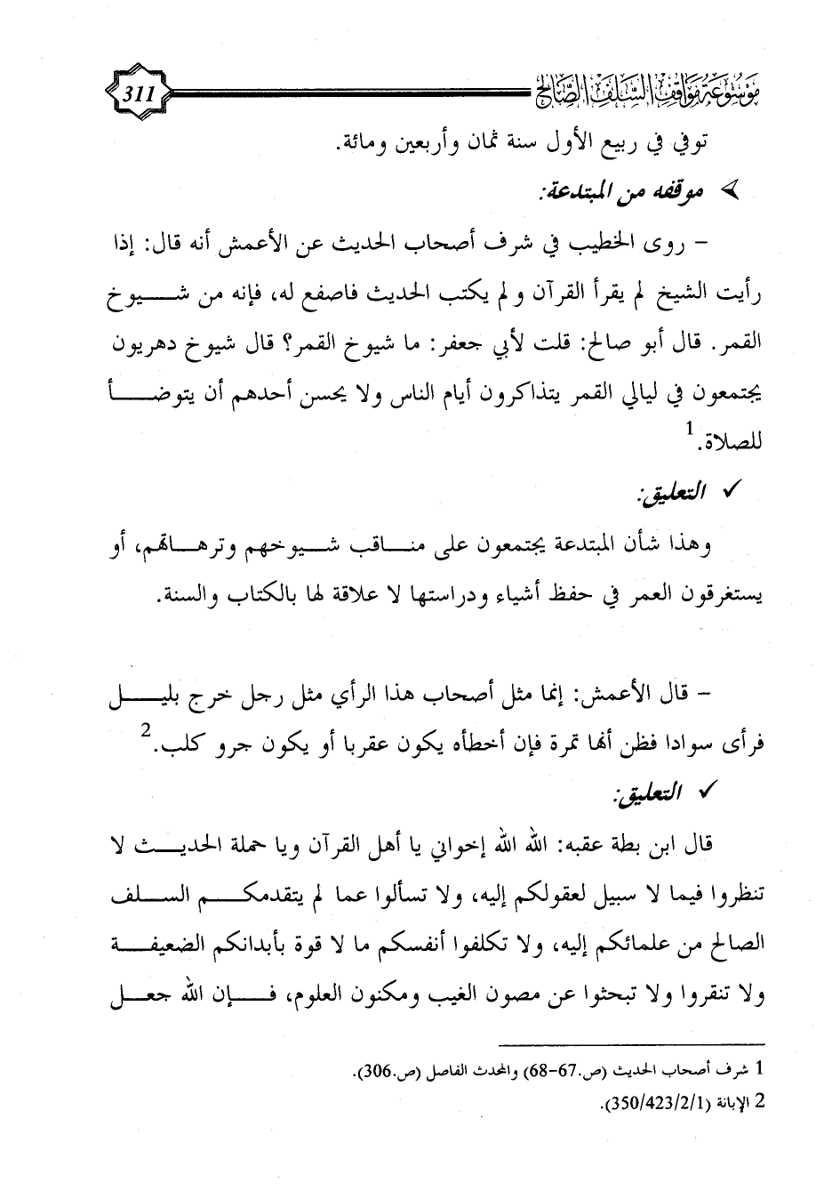 - روى الخطيب في شرف أصحاب الحديث عن الأعمش أنه قال: إذا رأيت الشيخ لم يقرأ القرآن ولم يكتب الحديث فاصفع له، فإنه من شيوخ القمر. قال أبو صالح: قلت لأبي جعفر: ما شيوخ القمر؟ قال شيوخ دهريون يجتمعون في ليالي القمر يتذاكرون أيام الناس ولا يحسن أحدهم أن يتوضأ للصلاة. (¬1)