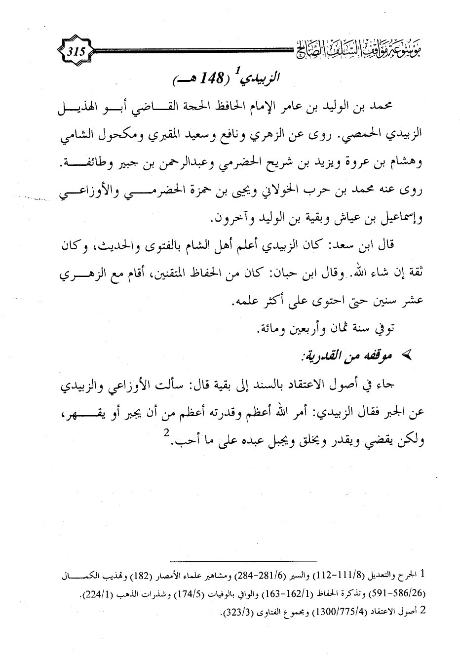 جاء في أصول الاعتقاد بالسند إلى بقية قال: سألت الأوزاعي والزبيدي عن الجبر فقال الزبيدي: أمر الله أعظم وقدرته أعظم من أن يجبر أو يقهر، ولكن يقضي ويقدر ويخلق ويجبل عبده على ما أحب. (¬2)