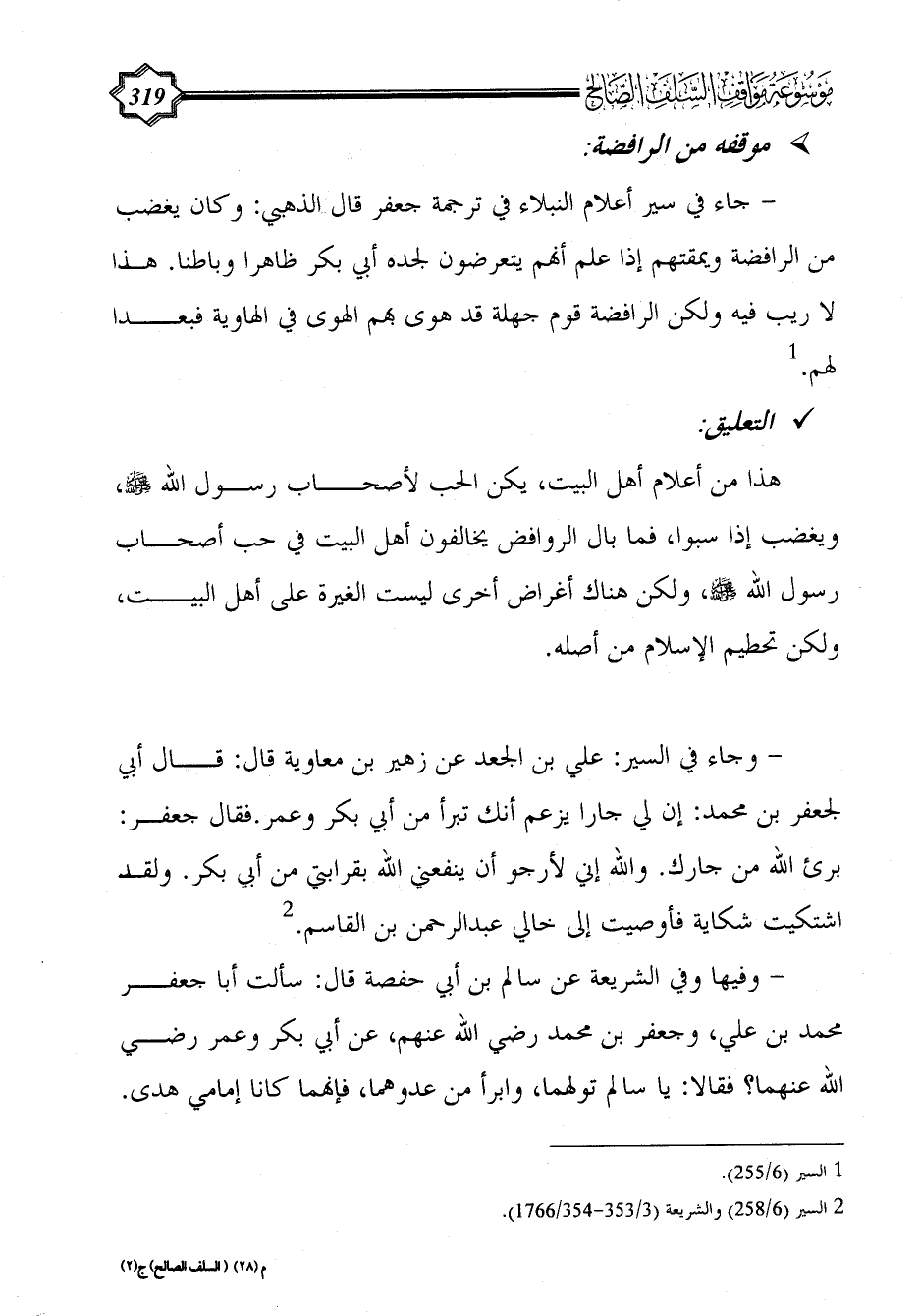 - جاء في سير أعلام النبلاء في ترجمة جعفر قال الذهبي: وكان يغضب من الرافضة ويمقتهم إذا علم أنهم يتعرضون لجده أبي بكر ظاهرا وباطنا. هذا لا ريب فيه ولكن الرافضة قوم جهلة قد هوى بهم الهوى في الهاوية فبعدا لهم. (¬1)