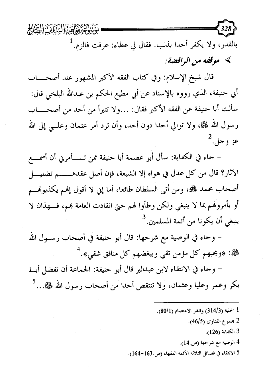 - قال شيخ الإسلام: وفي كتاب الفقه الأكبر المشهور عند أصحاب أبي حنيفة، الذي رووه بالإسناد عن أبي مطيع الحكم بن عبد الله البلخي قال: سألت أبا حنيفة عن الفقه الأكبر فقال: ... ولا تتبرأ من أحد من أصحاب رسول الله - صلى الله عليه وسلم -، ولا توالي أحدا دون أحد، وأن ترد أمر عثمان وعلي إلى الله عز وجل. (¬2)