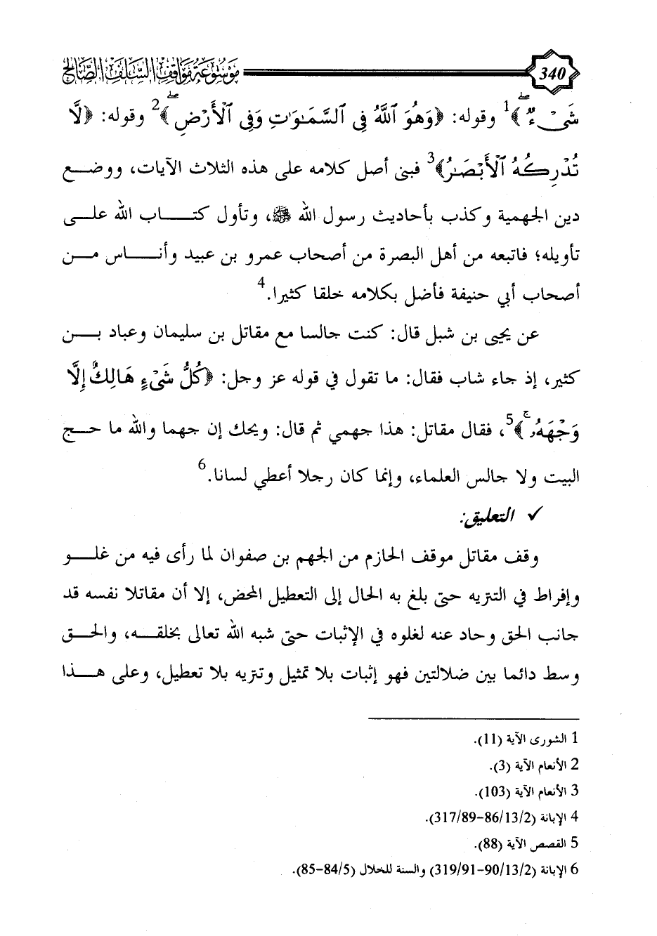 عن يحيى بن شبل قال: كنت جالسا مع مقاتل بن سليمان وعباد بن كثير، إذ جاء شاب فقال: ما تقول في قوله عز وجل: {كل شَيْءٍ هَالِكٌ إِلًّا وَجْهَهُ} (¬5)، فقال مقاتل: هذا جهمي ثم قال: ويحك إن جهما والله ما حج البيت ولا جالس العلماء، وإنما كان رجلا أعطي لسانا. (¬6)