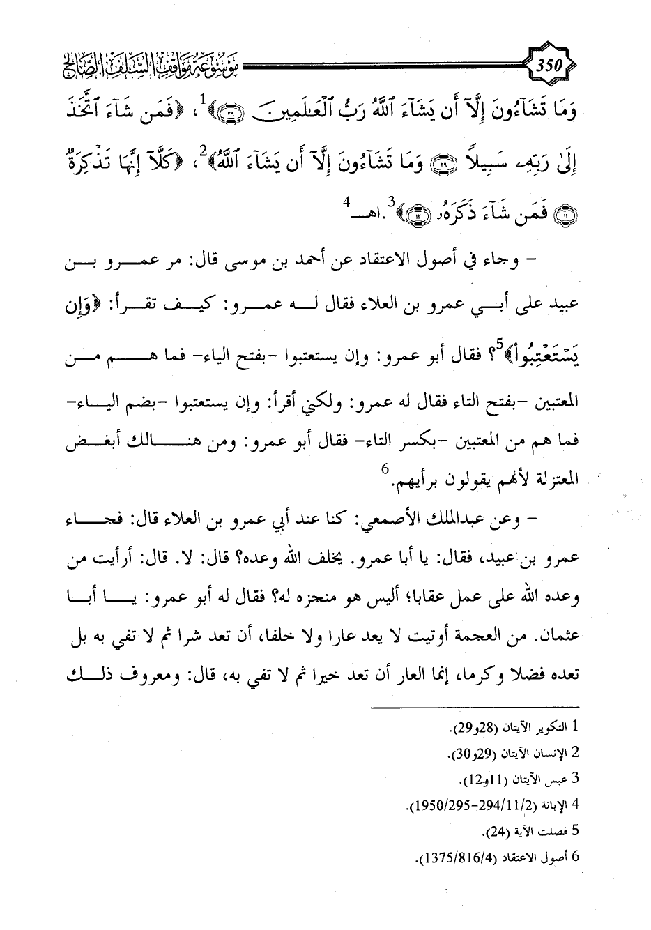 - وجاء في أصول الاعتقاد عن أحمد بن موسى قال: مر عمرو بن عبيد على أبي عمرو بن العلاء فقال له عمرو: كيف تقرأ: {وَإِنْ يستعتبوا} (¬5)؟ فقال أبو عمرو: وإن يستعتبوا -بفتح الياء- فما هم من المعتبين -بفتح التاء فقال له عمرو: ولكني أقرأ: وإن يستعتبوا -بضم الياء- فما هم من المعتبين -بكسر التاء- فقال أبو عمرو: ومن هنالك أبغض المعتزلة لأنهم يقولون برأيهم. (¬6)