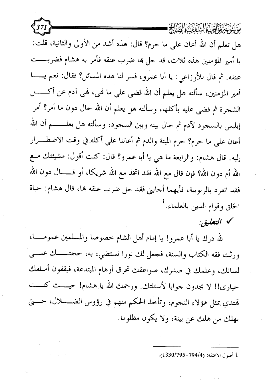 لله درك يا أبا عمرو! يا إمام أهل الشام خصوصا والمسلمين عموما، ورثت فقه الكتاب والسنة، فجعل لك نورا تستضيء به، حجتك على لسانك، وعلمك في صدرك، صواعقك تحرق أوهام المبتدعة، فيقفون أمامك حيارى!! لا يجدون جوابا لأسئلتك. ورحمك الله يا هشام! حيث كنت تهتدي بمثل هؤلاء النجوم، وتأخذ الحكم منهم في رؤوس الضلال، حتى يهلك من هلك عن بينة، ولا يكون مظلوما.