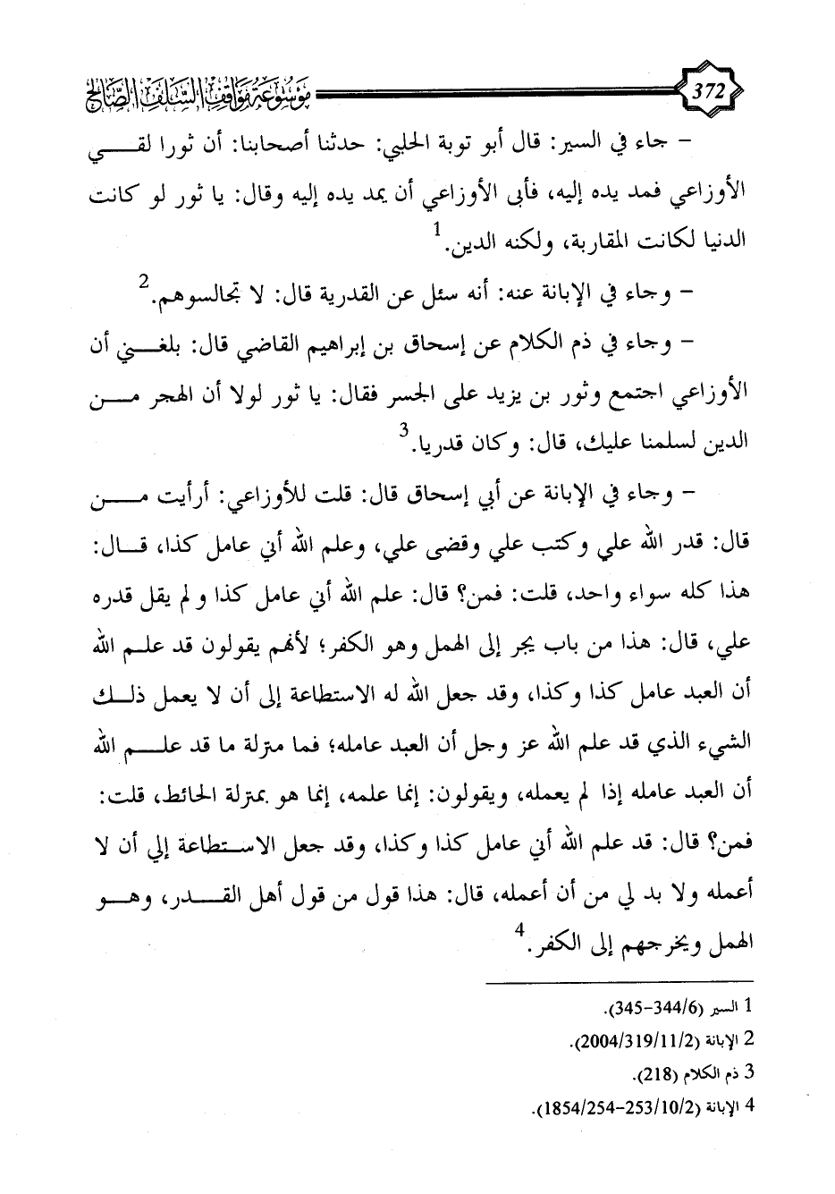 - وجاء في ذم الكلام عن إسحاق بن إبراهيم القاضي قال: بلغني أن الأوزاعي اجتمع وثور بن يزيد على الجسر فقال: يا ثور لولا أن الهجر من الدين لسلمنا عليك، قال: وكان قدريا. (¬3)