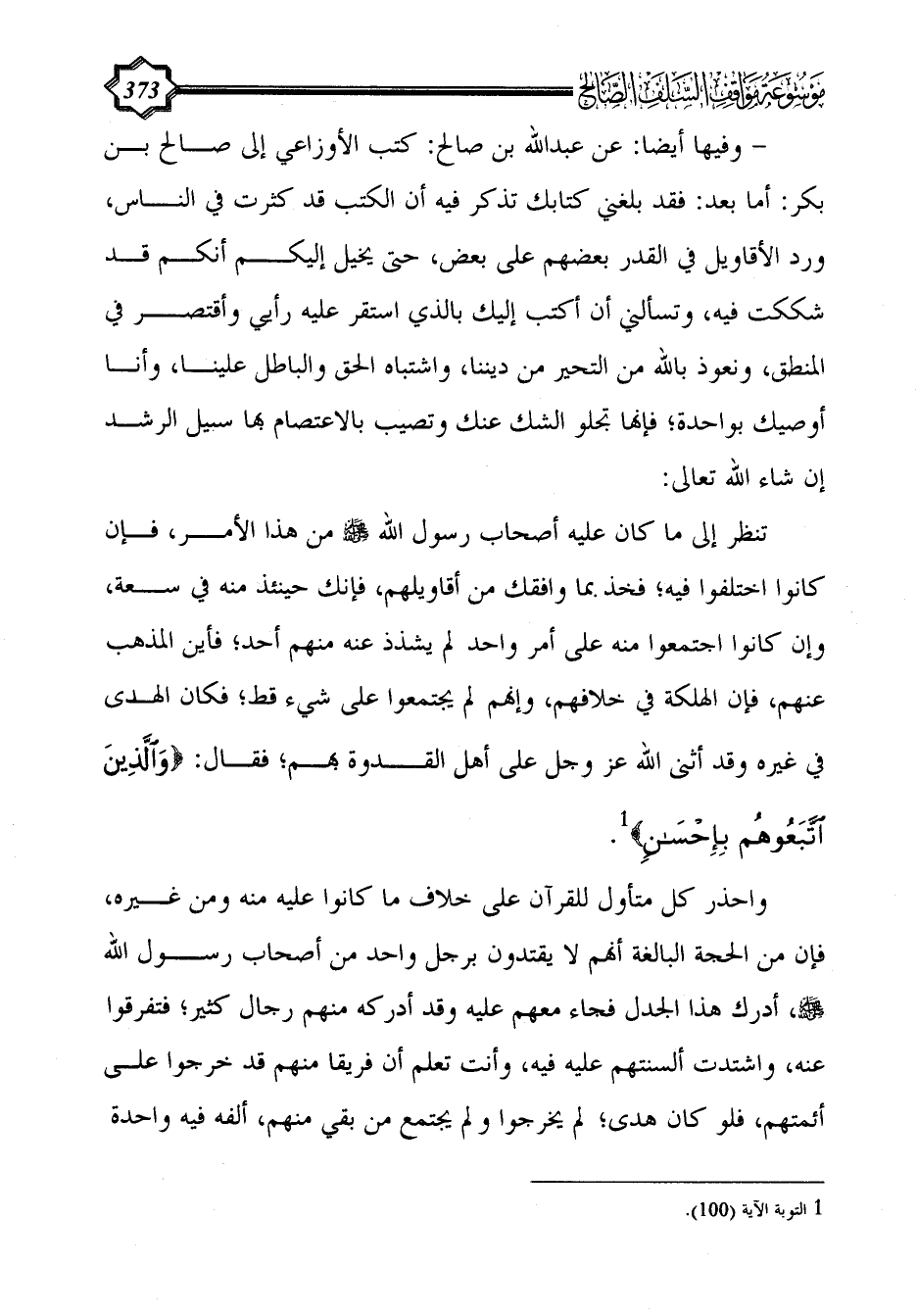 - وفيها أيضا: عن عبد الله بن صالح: كتب الأوزاعي إلى صالح بن بكر: أما بعد: فقد بلغني كتابك تذكر فيه أن الكتب قد كثرت في الناس، ورد الأقاويل في القدر بعضهم على بعض، حتى يخيل إليكم أنكم قد شككت فيه، وتسألني أن أكتب إليك بالذي استقر عليه رأيي وأقتصر في المنطق، ونعوذ بالله من التحير من ديننا، واشتباه الحق والباطل علينا، وأنا أوصيك بواحدة؛ فإنها تجلو الشك عنك وتصيب بالاعتصام بها سبيل الرشد إن شاء الله تعالى: