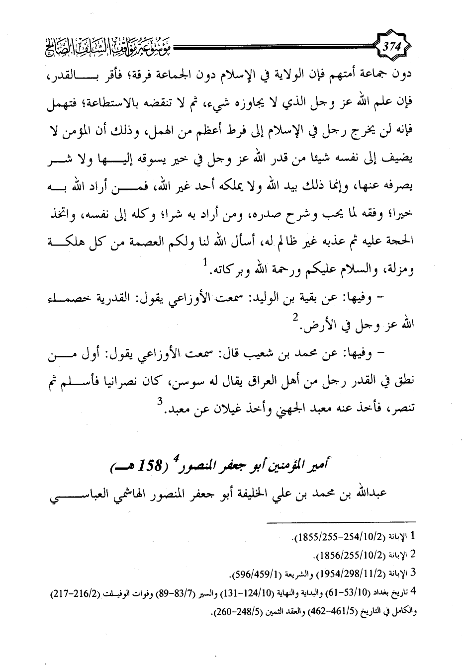 - وفيها: عن بقية بن الوليد: سمعت الأوزاعي يقول: القدرية خصماء الله عز وجل في الأرض. (¬2)