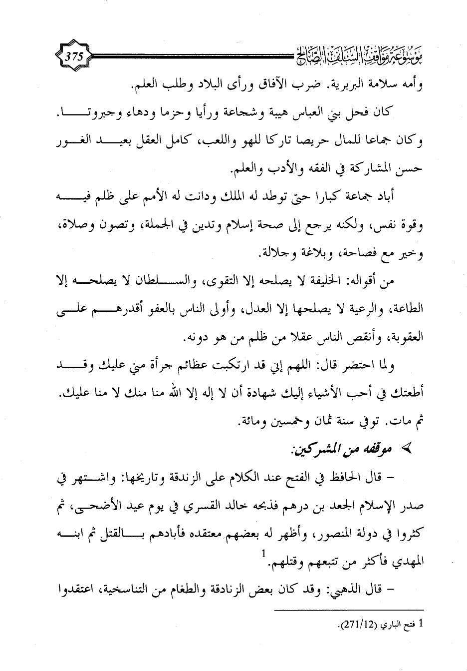 - قال الحافظ في الفتح عند الكلام على الزندقة وتاريخها: واشتهر في صدر الإسلام الجعد بن درهم فذبحه خالد القسري في يوم عيد الأضحى، ثم كثروا في دولة المنصور، وأظهر له بعضهم معتقده فأبادهم بالقتل ثم ابنه المهدي فأكثر من تتبعهم وقتلهم. (¬1)